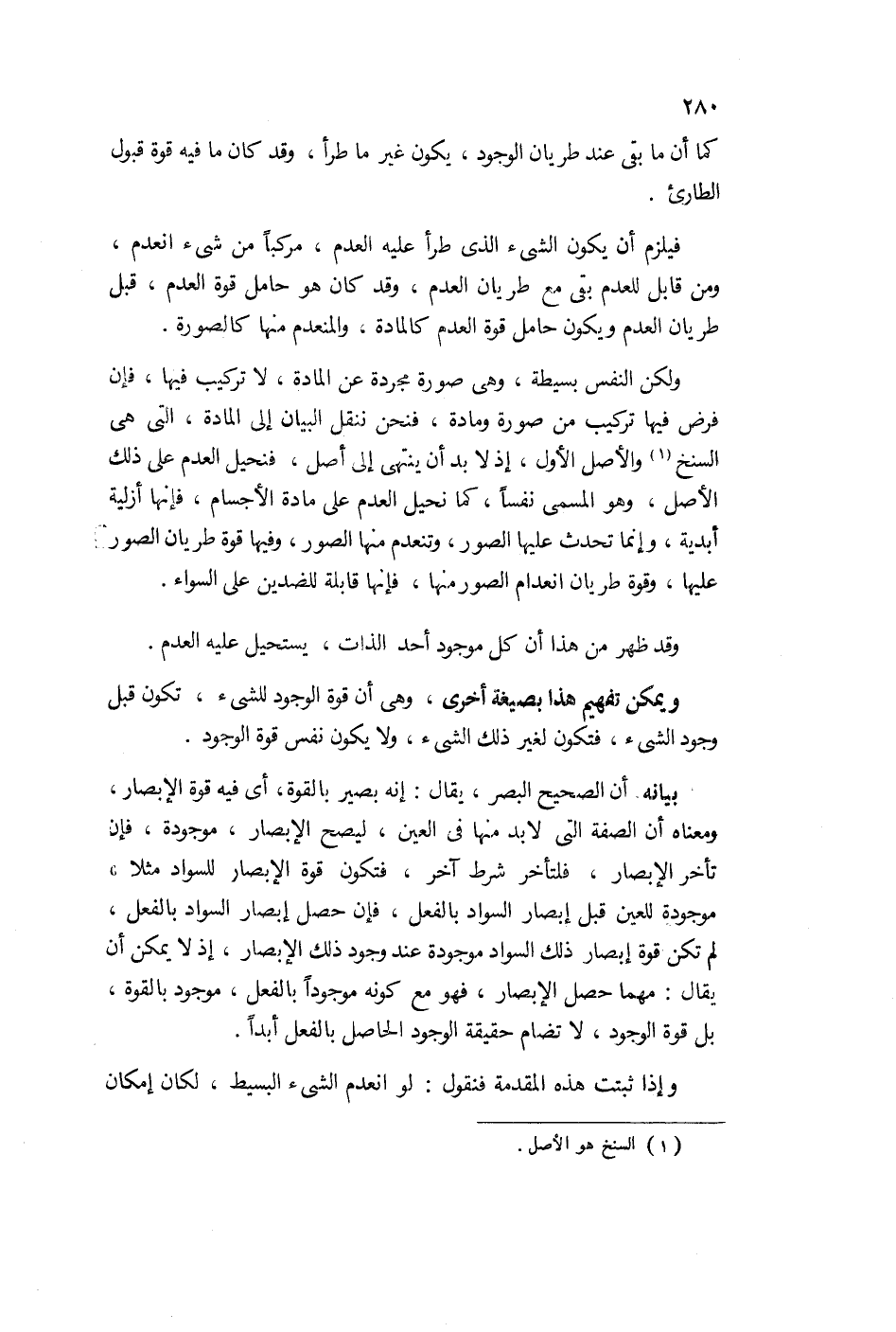 فيلزم أن يكون الشيء الذي طرى عليه العدم مركباً من شيء انعدم ومن قابل للعدم بقي مع طريان العدم وقد كان هو حامل قوة العدم قبل طريان العدم ويكون حامل القوة كالمادة والمنعدم منها كالصورة.