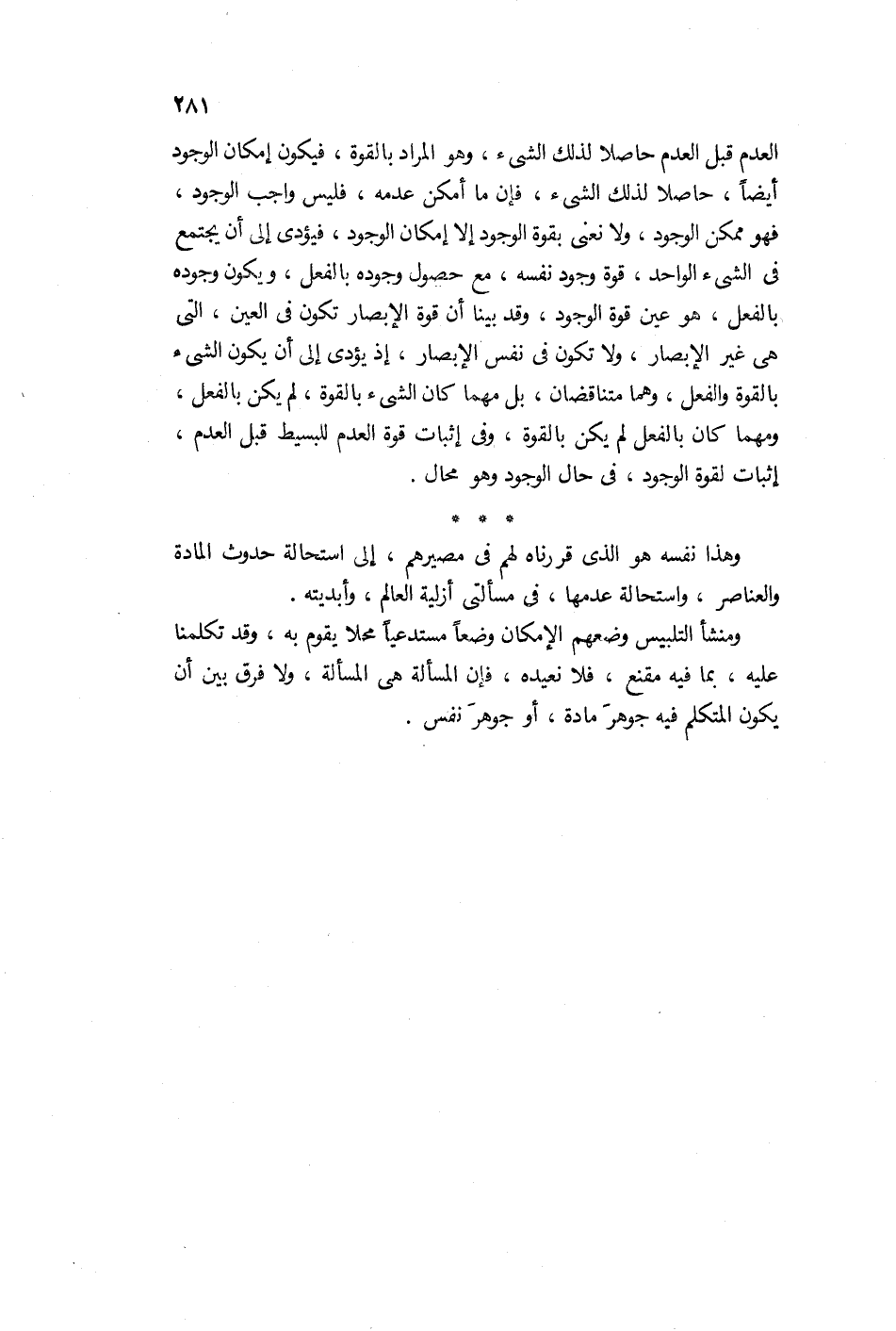 وهذا بعينه هو الذي قررناه لهم في مصيرهم إلى استحالة حدوث المادة والعناصر واستحالة عدمها في مسألة أزلية العالم وأبديته ومنشأ التلبيس وضعهم الإمكان وصفاً مستدعياً محلاً يقوم به. وقد تكمنا عليه بما فيه مقنع فلا نعيد فإن المسألة هي المسألة فلا فرق بين أن يكون المتكلم فيه جوهر مادة أو جوهر نفس.