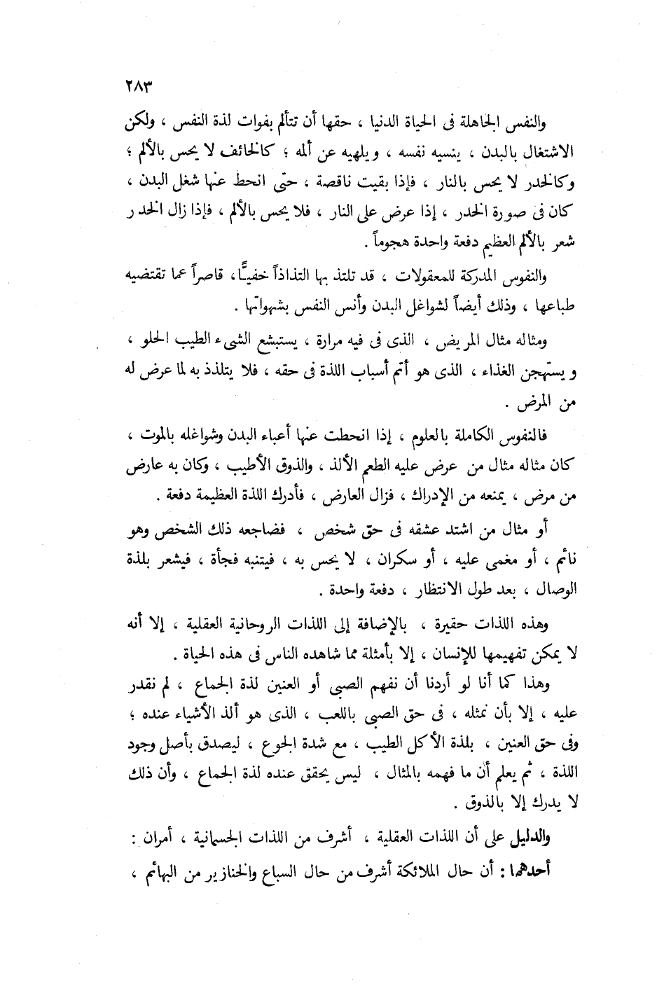 والنفوس المدركة للمعقولات قد تلتذ بها التذاذاً خفياً قاصراً عما يقتضيه طباعه وذلك أيضاً لشواغل البدن وأنس النفس بشهواتها. ومثاله مثال المريض الذي في فيه مرارة يستبشع الشيء الطيب الحلو ويستهجن الغذاء الذي هو أتم أسباب اللذة في حقه فلا يتلذذ به لما عرض من المرض.