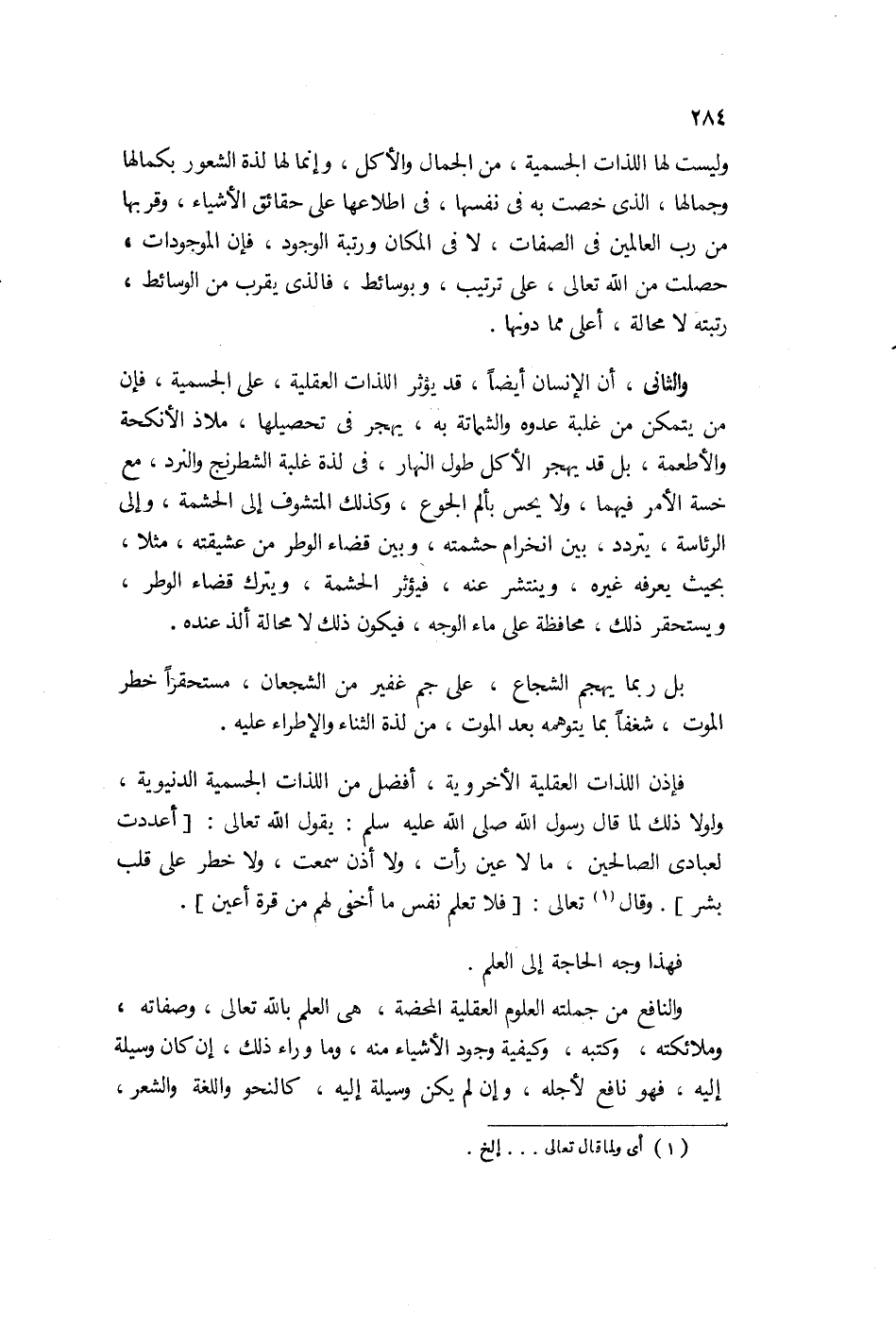 فإذن اللذات العقلية الأخروية أفضل من اللذات الحسية الدنيوية ولولا ذلك لما قال رسول الله صلى الله عليه وسلم: أعددت لعبادي الصالحين ما لا عين رأت ولا أذن سمعت ولا خطر على قلب بشر. وقال تعالى: "لا تعلم نفس ما أخفي لهم من قرة أعين" فهذا وجه الحاجة إلى العلم.