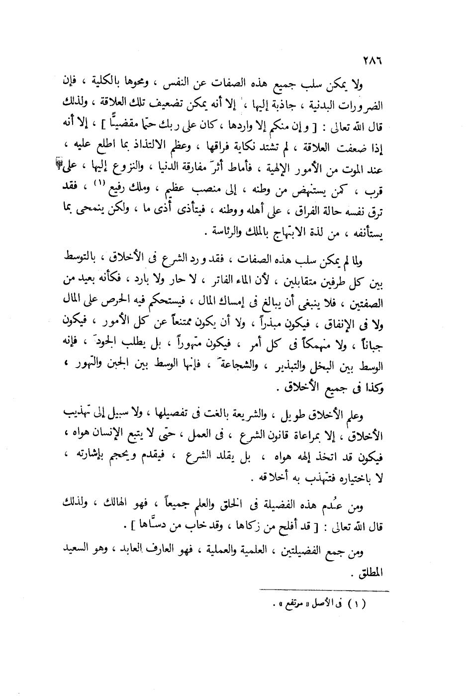 وإذا لم يكن سلب هذه الصفات ورد الشرع في الأخلاق بالتوسط بين كل طرفين متقابلين لأن الماء الفاتر لا حار ولا بارد فكأنه بعيد عن الصفتين فلا ينبغي أن يبالغ في إمساك المال فيستحكم فيه حرص المال ولا في الإنفاق فيكون مبذراً ولا أن يكون ممتنعاً عن كل الأمور فيكون جباناً ولا منهمكاً في كل أمر فيكون متهوراً، بل يطلب الجود فإنه الوسط بين البخل والتبذير والشجاعة فإنها الوسط بين الجبن والتهور وكذلك في جميع الأخلاق، وعلم الأخلاق طويل والشريعة بالغت في تفصيلها ولا سبيل في تهذيب الأخلاق إلا بمراعاة قانون الشرع في العمل حتى لا يتبع الإنسان هواه فيكون قد اتخذ إلهه هواه بل يقلد الشرع فيقدم ويحجم بإشارته لا باختياره فتتهذب به أخلاقه.