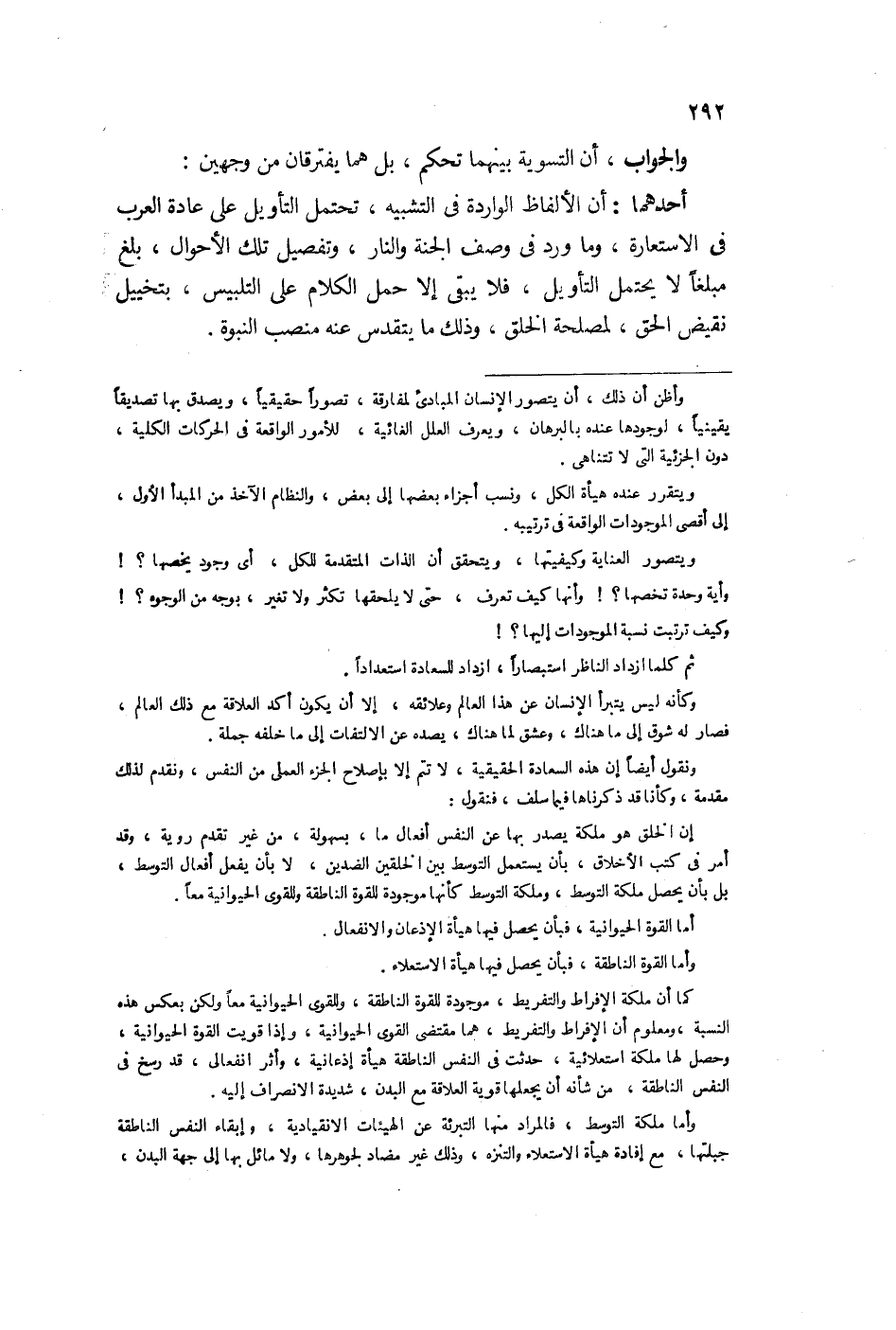 والجواب أن التسوية بينهما تحكم بل هما يفترقان من وجهين: أحدهما أن الألفاظ الواردة في التشبيه تحتمل التأويل على عادة العرب في الاستعارة وما ورد في وصف الجنة والنار وتفصيل تلك الأحوال بلغ مبلغاً لا يحتمل التأويل فلا يبقى إلا خمل الكلام على التلبيس بتخييل نقيض الحق لمصلحة الخلق وذلك مما يتقدس عنه منصب النبوة.