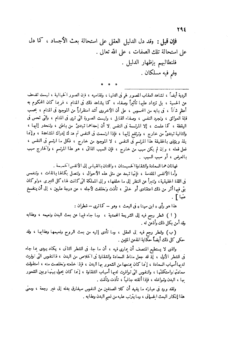 فإن قيل: وقد دل الدليل العقلي على استحالة بعث الأجساد كما دل على استحالة تلك الصفات على الله تعالى.