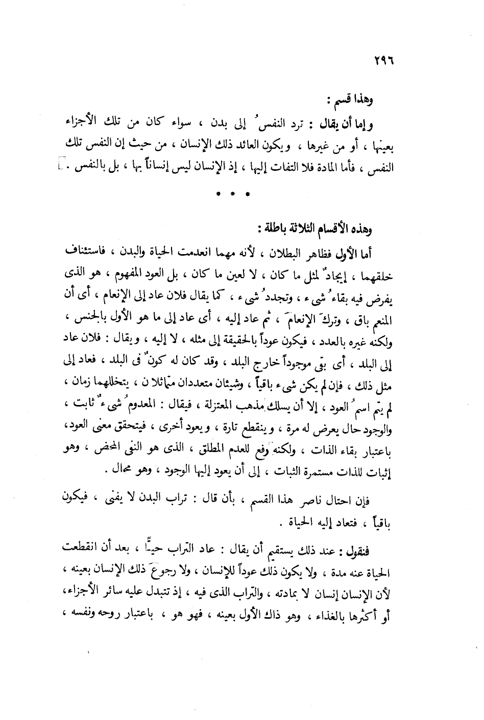 أما الأول فظاهر البطلان لأنه مهما انعدمت الحيوة والبدن فاستئناف خلقها إيجاد لمثل ما كان لا لعين ما كان، بل العود المفهوم هو الذي يفرض فيه بقاء شيء وتجد شيء، كما يقال: فلان عاد إلى الإنعام أي أن المنعم باق، وترك الإنعام ثم عاد إليه أي عاد إلى ما هو الأول بالجنس ولكنه غيره بالعدد فيكون عوداً بالحقيقة إلى مثله لا إليه. ويقال: فلان عاد إلى البلد أي بقي موجوداً خارجاً وقد كان له كون في البلد فعاد إلى مثل ذلك فإن لم يكن شيء باق وشيئان متعددان متماثلان يتخللهما زمان لم يتم اسم العود، إلا أن يسلك مذهب المعتزلة فيقال: المعدوم شيء ثابت والوجود حال يعرض له مرة وينقطع تارة ويعود أخرى فيتحقق معنى العود باعتبار بقاء الذات ولكنه رفع للعدم المطلق الذي هو النفي المحض وهو إثبات للذات مستمرة الثبات إلى أن يعود إليه الوجود وهو محال.