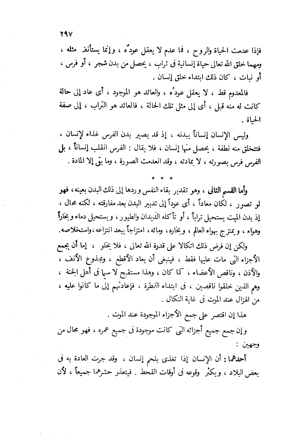 وأما القسم الثاني وهو تقدير بقاء النفس ورده إلى ذلك البدن بعينه فهو لو تصور لكان معاداً أي عوداً إلى تدبير البدن بعد مفارقته ولكن محال إذ بدن الميت ينحل تراباً أو تأكله الديدان والطيور ويستحيل دماً وبخاراً وهواء ويمتزج بهواء العالم وبخاره ومائه امتزاجاً يبعد انتزاعه واستخلاصه.