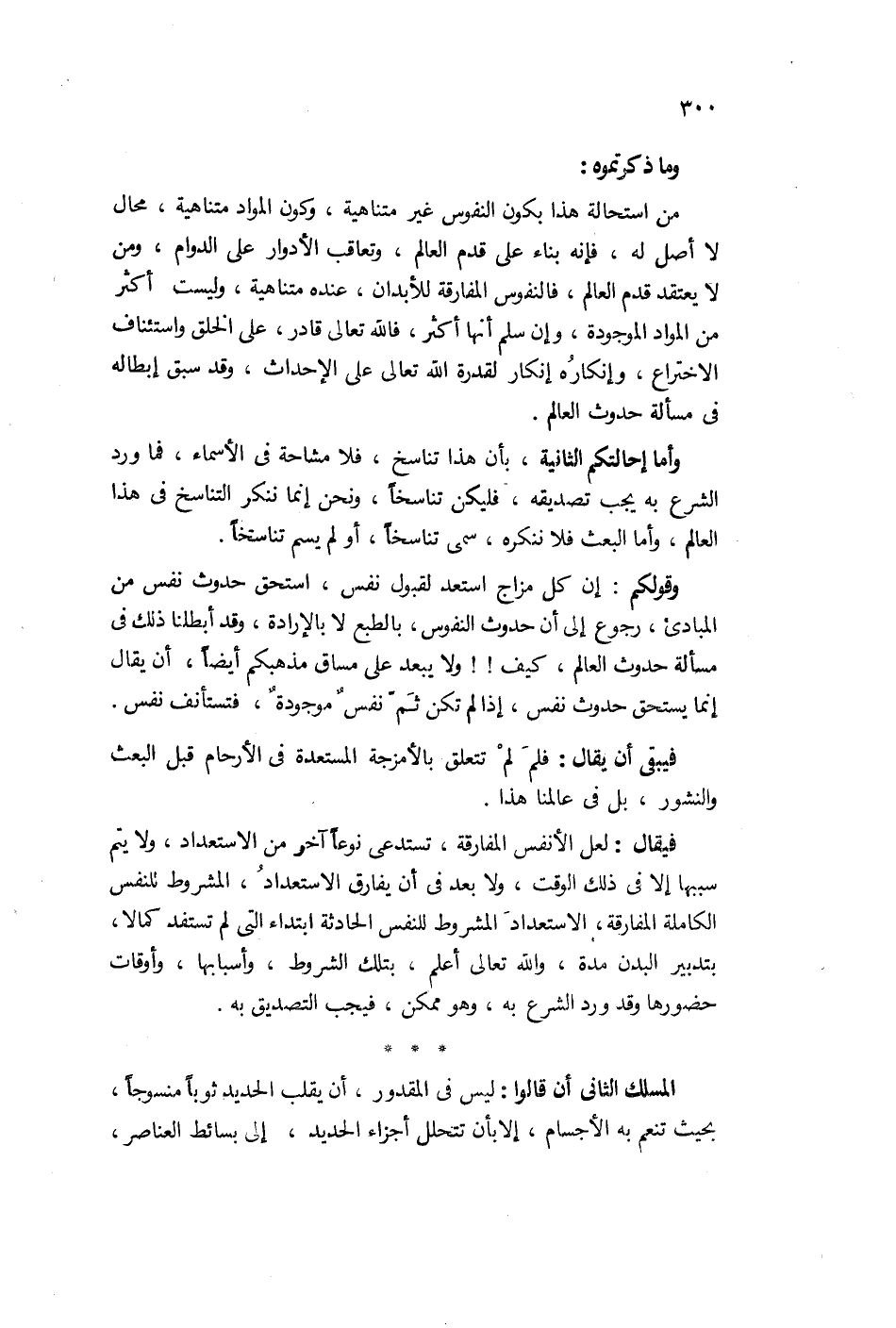 وأما إحالتكم الثانية بأن هذا تناسخ فلا مشاحة في الأسماء فما ورد الشرع به يجب تصديقه فليكن تناسخاً وإنما نحن ننكر التناسخ في هذا العالم. فأما البعث فلا ننكره سمي تناسخاً أو لم يسم.