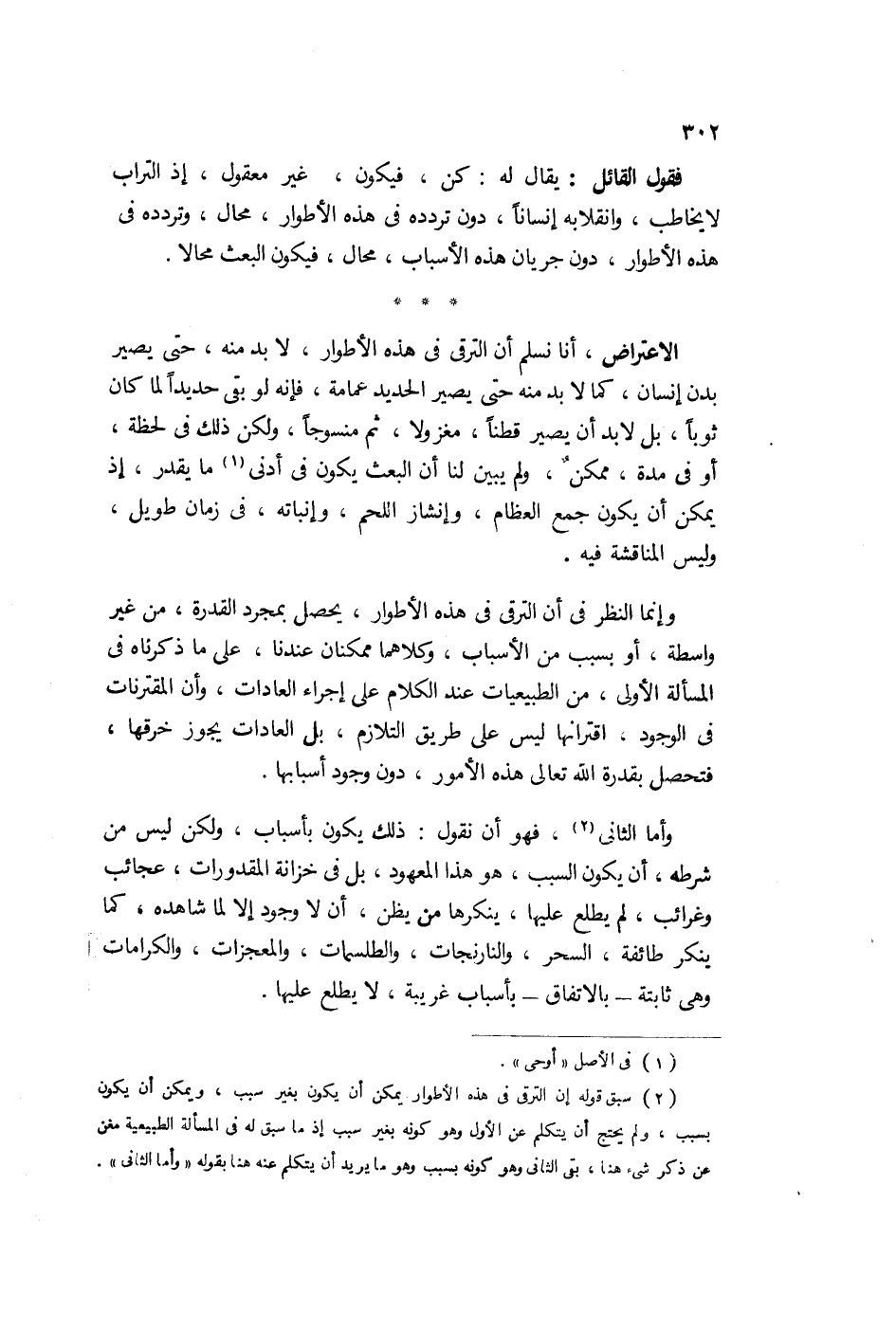 وإنما النظر في أن الترقي في هذه الأطوار يحصل بمجرد القدرة من غير واسطة أو بسبب من الأسباب، وكلاهما ممكنان عندنا كما ذكرناه في المسألة الأولى من الطبيعيات عند الكلام على إجراء العادات، وإن المقترنات في الوجود اقترانها ليس على طريق التلازم بل العادات يجوز خرقها فيحصل بقدرة الله تعالى هذه الأمور دون وجود أسبابها.