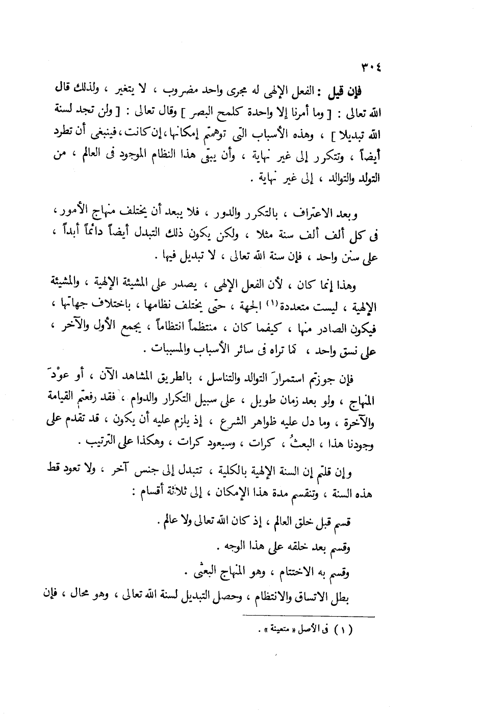 فإن قيل: الفعل الإلهي له مجرى واحد مضروب لا يتغير ولذلك قال تعالى: "وما أمرنا إلا واحدة كلمح بالبصر" وقال: "ولن تجد لسنة الله تبديلا" وهذه الأسباب التي أوهمتهم إمكانها إن كانت فينبغي أن تطرد أيضاً وتتكرر إلى غير غاية وأن يبقى هذا النظام الموجود في العالم من التولد والتوالد إلى غير غاية. وبعد الاعتراف بالتكرر والدور فلا يبعد أن يختلف منهاج الأمور في كل ألف ألف سنة مثلاً ولكن يكون ذلك التبدل أيضاً دائماً أبدياً على سنن واحد فإن سنة الله لا تبديل فيها.
