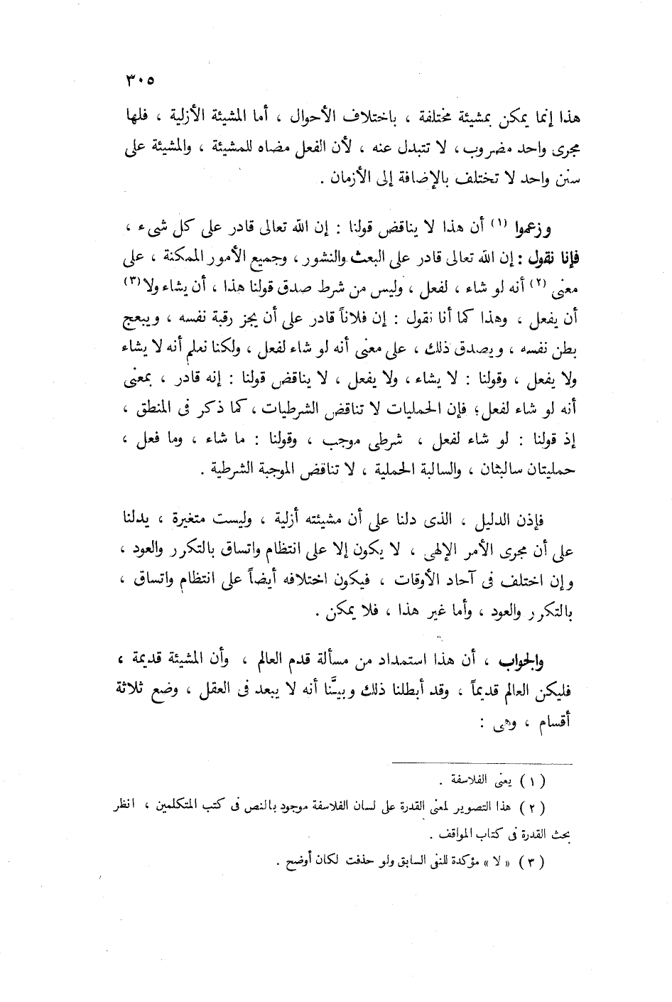 وقولنا: لا يشاء ولا يفعل لا يناقض قولنا إنه قادر بمعنى أنه لو شاء لفعل فإن الحمليات لا تناقض الشرطيات كما ذكر في المنطق إذ قولنا: لو شاء لفعل، شرطي موجب وقولنا: ما شاء وما فعل، حملتان سالبتان والسالبة الحملية لا تناقض الموجبة الشرطية. فإذن الدليل الذي دلنا على أن مشيئة أزلية وليست متفننة يدلنا على أن مجرى الأمر الإلهي لا يكون إلا على انتظام وإن اختلفت في آحاد الأوقات فيكون اختلافها أيضاً على انتظام واتساق بالتكرر والعود وأما غير هذا فلا يمكن.