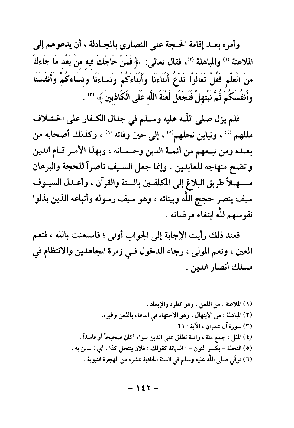 فلم يزل صلى الله عليه وسلم في جدال الكفار على اختلاف مللهم، وتباين نحلهم، إلى حين وفاته، وكذلك أصحابه من بعده ومن تبعهم من أئمة الدين وحماته، وبهذا الأمر قام الدين واتضح منهاجه للعابدين، وإنما جعل السيف ناصرا للحجة والبرهان مسهلا طريق البلاغ إلى المكلفين بالسنة والقرآن، وأعدل السيوف سيف ينصر حجج الله وبيناته، وهو سيف رسوله وأتباعه الذين بذلوا نفوسهم لله ابتغاء مرضاته.