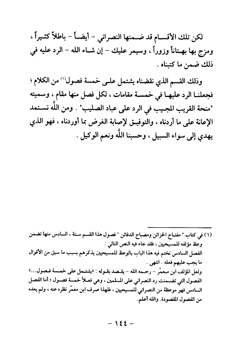وذلك القسم الذي نقضناه يشتمل على خمسة فصول من الكلام؛ فجعلنا الرد عليها في خمسة مقامات، لكل فصل منها مقام، وسميته "منحة القريب المجيب في الرد على عباد الصليب". ومن الله نستمد الإعانة على ما أردناه، والتوفيق لإصابة الغرض بما أوردناه، فهو الذي يهدي إلى سواء السبيل، وحسبنا الله ونعم الوكيل.