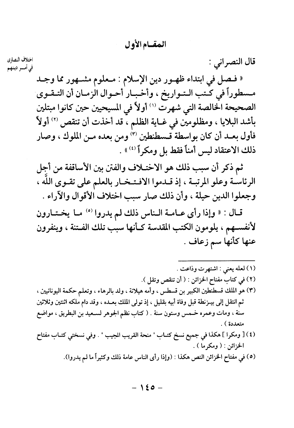"فصل في ابتداء ظهور دين الإسلام: معلوم مشهور مما وجد مسطورا في كتب التواريخ، وأخبار أحوال الزمان أن التقوى الصحيحة الخالصة التي شهرت أولا في المسيحيين حين كانوا مبتلين بأشد البلايا، ومظلومين في غاية الظلم، قد أخذت أن تنقص أولا فأول بعد أن كان بواسطة قسطنطين ومن بعده من الملوك، وصار ذلك الاعتقاد ليس أمنا فقط بل ومكرا".
