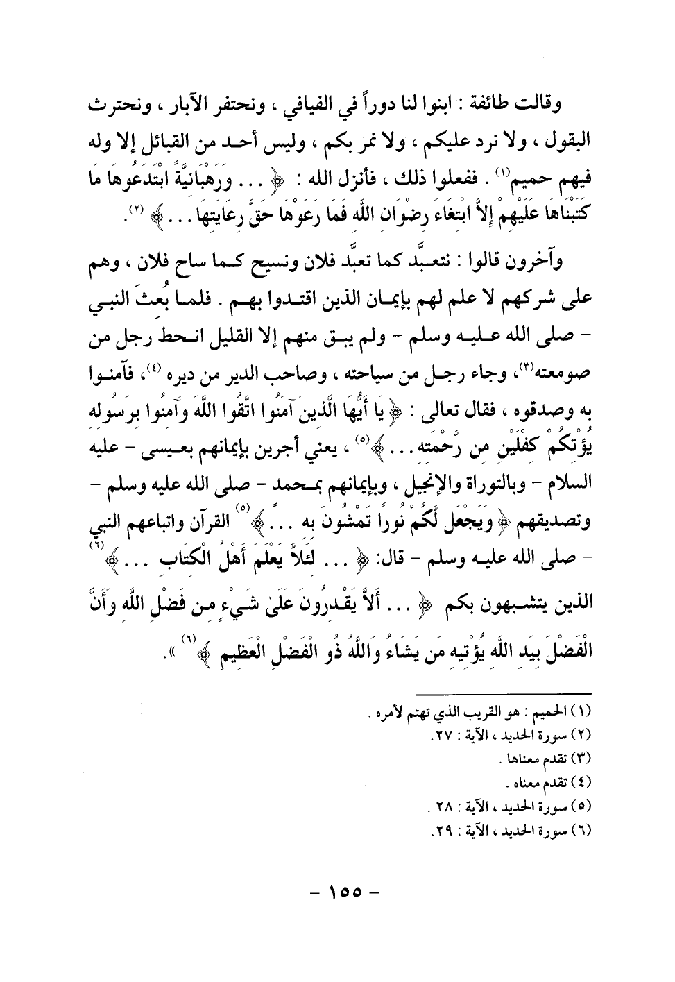 وآخرون قالوا: نتعبد كما تعبد فلان ونسيح كما ساح فلان، وهم على شركهم لا علم لهم بإيمان الذين اقتدوا بهم، فلما بعث النبي -صلى الله عليه وسلم- ولم يبق منهم إلا القليل انحط رجل من صومعته، وجاء رجل من سياحته، وصاحب الدير من ديره، فآمنوا به وصدقوه، فقال تعالى: {يَا أَيُّهَا الَّذِينَ آمَنُوا اتَّقُوا اللَّهَ وَآمِنُوا بِرَسُولِهِ يُؤْتِكُمْ كِفْلَيْنِ مِنْ رَحْمَتِهِ} ، يعني: أجرين بإيمانهم بعيسى -عليه السلام- وبالتوراة والإنجيل، وبإيمانهم بمحمد -صلى الله عليه وسلم- وتصديقهم {وَيَجْعَلْ لَكُمْ نُورًا تَمْشُونَ بِهِ} القرآن واتباعهم النبي -صلى الله عليه وسلم- قال - {لِئَلَّا يَعْلَمَ أَهْلُ الْكِتَابِ} الذين يتشبهون بكم: {أَلَّا يَقْدِرُونَ عَلَى شَيْءٍ مِنْ فَضْلِ اللَّهِ وَأَنَّ الْفَضْلَ بِيَدِ اللَّهِ يُؤْتِيهِ مَنْ يَشَاءُ وَاللَّهُ ذُو الْفَضْلِ الْعَظِيمِ} .