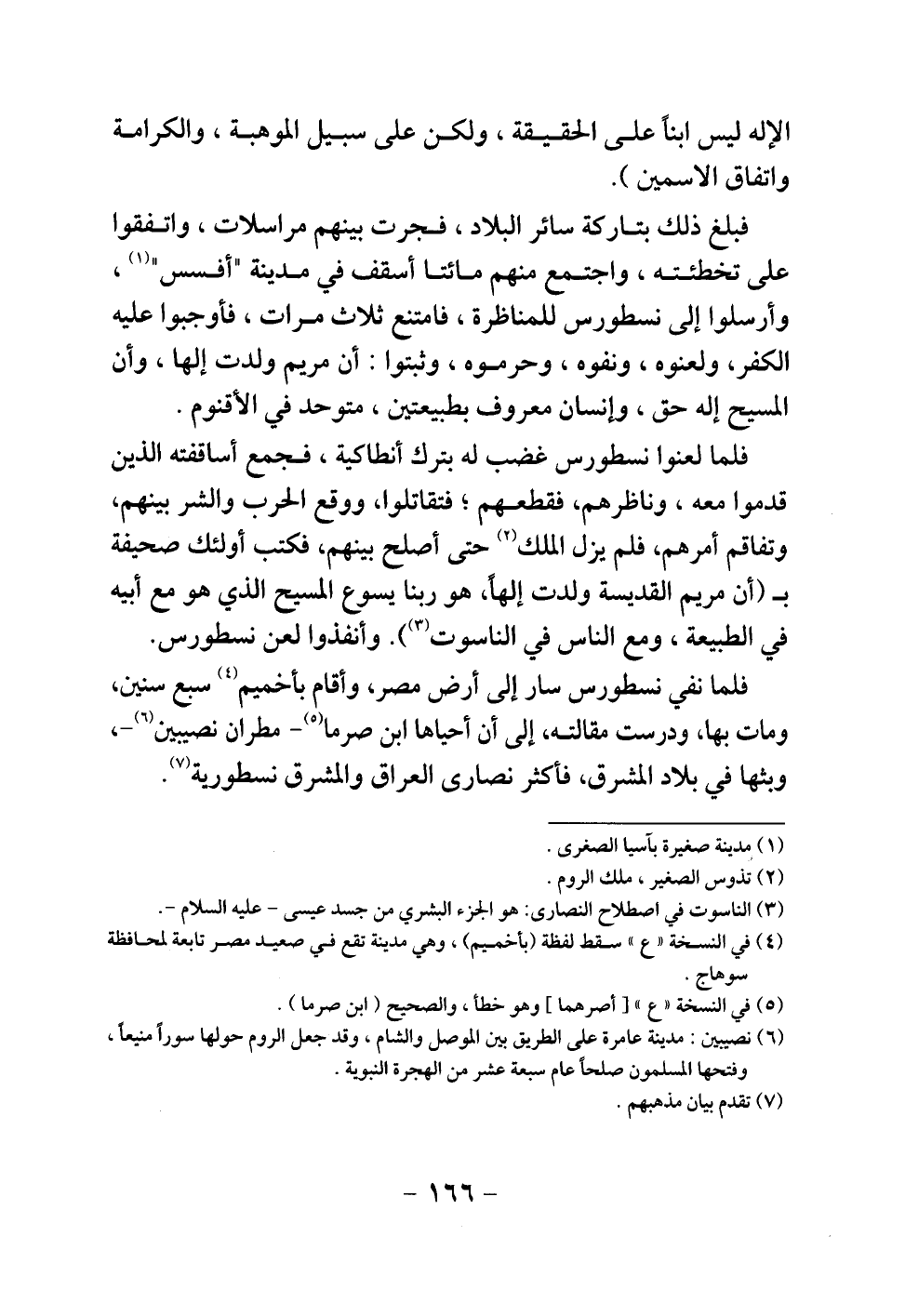 فبلغ ذلك بتاركة سائر البلاد، فجرت بينهم مراسلات، واتفقوا على تخطئته، واجتمع منهم مائتا أسقف في مدينة "أفسس"، وأرسلوا إلى نسطورس للمناظرة، فامتنع ثلاث مرات، فأوجبوا عليه الكفر، ولعنوه، ونفوه، وحرموه، وثبتوا: أن مريم ولدت إلها، وأن المسيح إله حق، وإنسان معروف بطبيعتين، متوحد في الأقنوم.