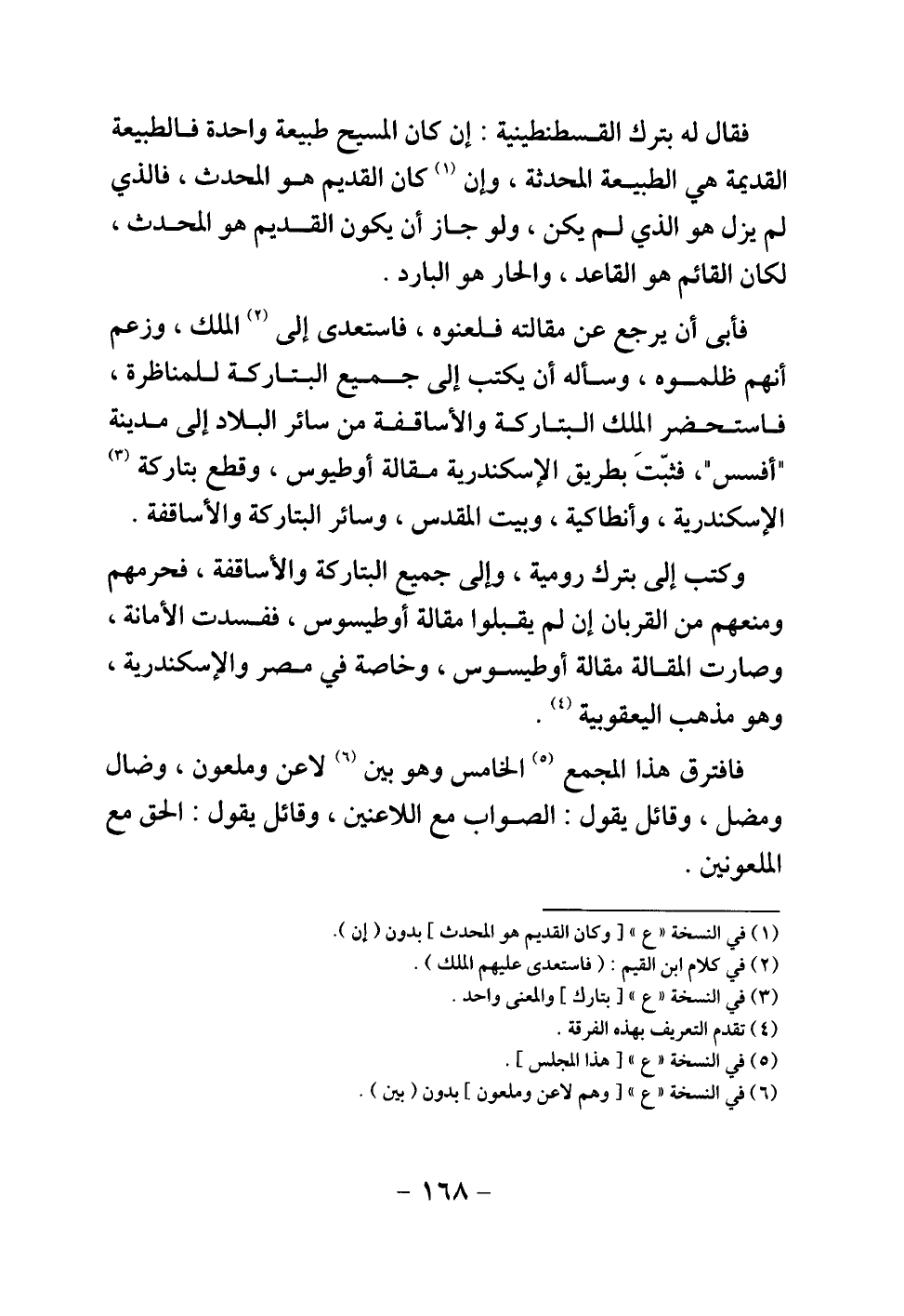 فقال له بترك القسطنطنية: إن كان المسيح طبيعة واحدة فالطبيعة القديمة هي الطبيعة المحدثة، وإن كان القديم هو المحدث، فالذي لم يزل هو الذي لم يكن، ولو جاز أن يكون القديم هو المحدث، لكان القائم هو القاعد، والحار هو البارد.