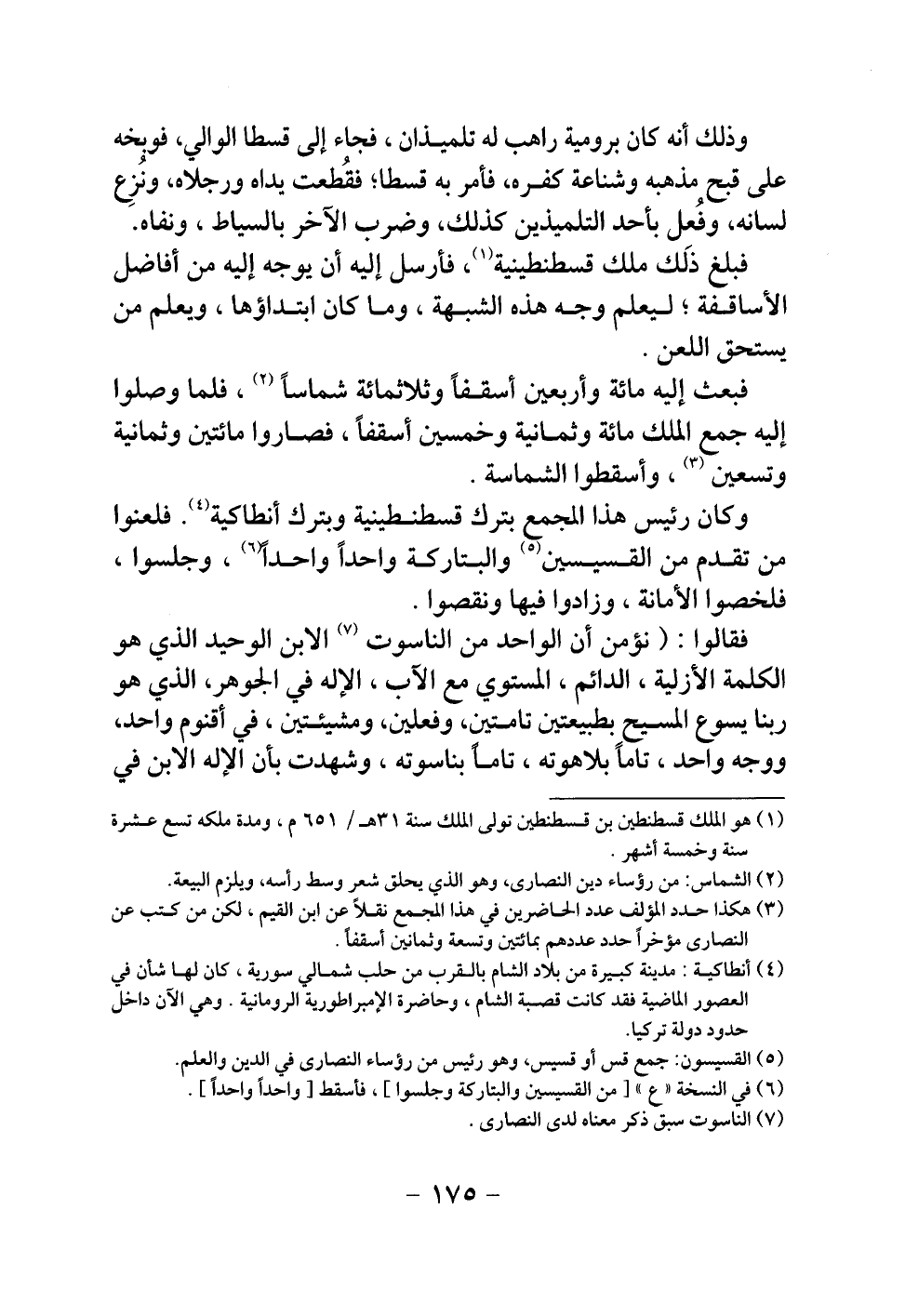 فبلغ ذلك ملك قسطنطينية، فأرسل إليه أن يوجه إليه من أفاضل الأساقفة، ليعلم وجه هذه الشبهة، وما كان ابتداؤها، ويعلم من يستحق اللعن.