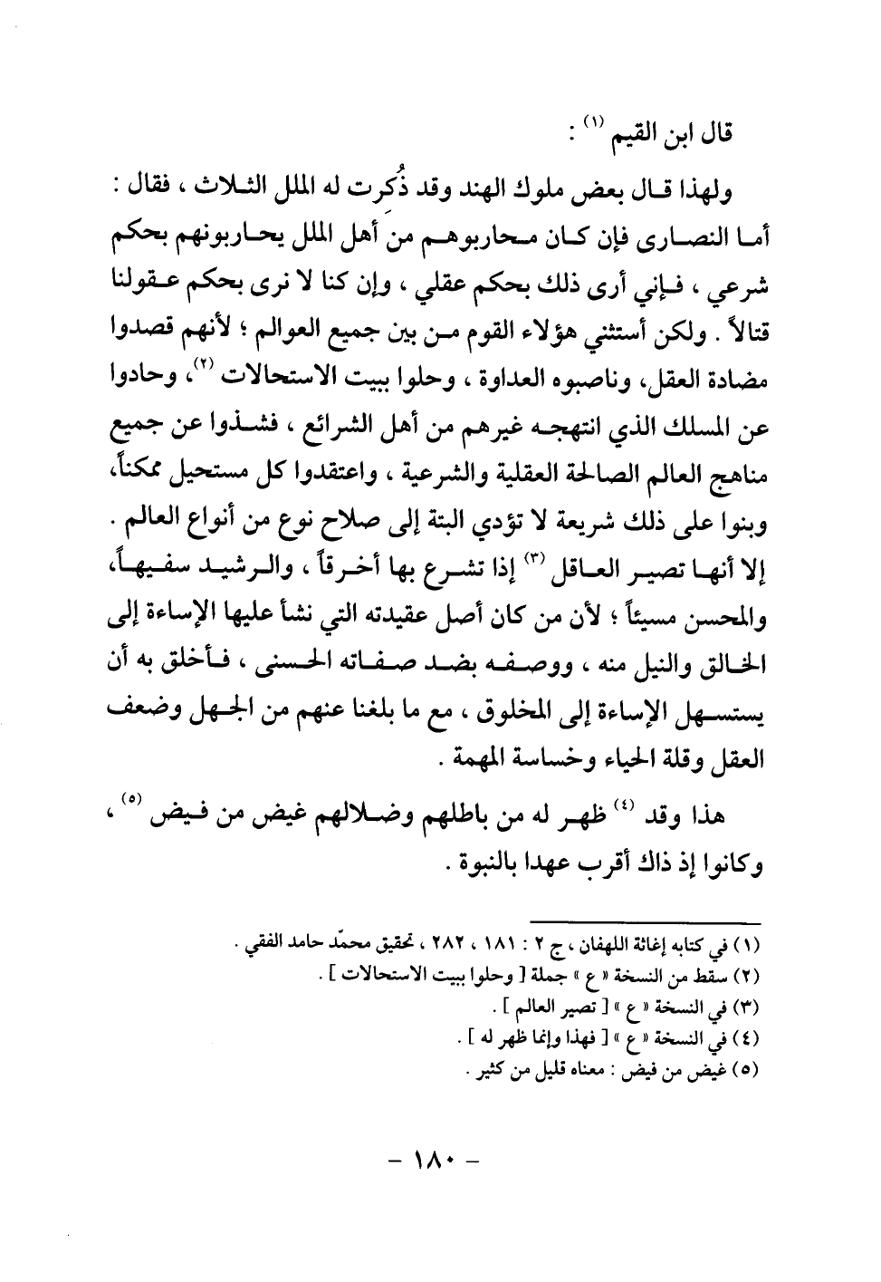 ولهذا قال بعض ملوك الهند وقد ذكرت له الملل الثلاث، فقال: أما النصارى فإن كان محاربوهم من أهل الملل يحاربونهم بحكم شرعي، فإني أرى ذلك بحكم عقلي، وإن كنا لا نرى بحكم عقولنا قتالا. ولكن أستثني هؤلاء القوم من بين جميع العوالم، لأنهم قصدوا مضادة العقل، وناصبوه العداوة، وحلوا ببيت الاستحالات، وحادوا عن المسلك الذي انتهجه غيرهم من أهل الشرائع، فشذوا عن جميع مناهج العالم الصالحة العقلية والشرعية، واعتقدوا كل مستحيل ممكنا، وبنوا على ذلك شريعة لا تؤدي ألبتة إلى صلاح نوع من أنواع العالم، إلا أنها تصير العاقل إذا تشرع بها أخرقا، والرشيد سفيها، والمحسن مسيئا، لأن من كان أصل عقيدته التي نشأ عليها الإساءة إلى الخالق والنيل منه، ووصفه بضد صفاته الحسنى، فأخلق به أن يستسهل الإساءة إلى المخلوق، مع ما بلغنا عنهم من الجهل وضعف العقل وقلة الحياء وخساسة المهمة.