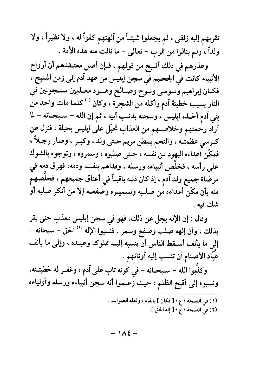 وقال: إن الإله يجل عن ذلك، فهو في سجن إبليس معذب حتى يقر بذلك، وأن إلهه صلب وصفع وسمر، فنسبوا الإله الحق -سبحانه- إلى ما يأنف أسقط الناس أن ينسبه إليه مملوكه وعبده، وإلى ما يأنف عباد الأصنام أن تنسب إليه أوثانهم.