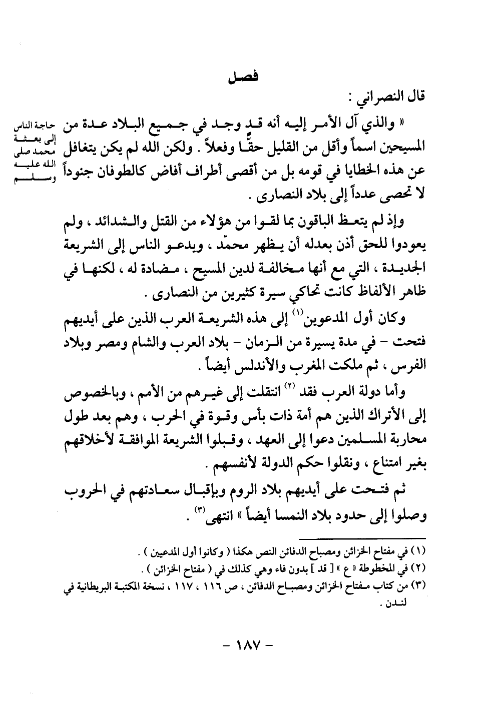 "والذي آل إليه أنه قد وجد في جميع البلاد عدة من المسيحيين اسما وأقل من القليل حقا وفعلا، ولكن الله لم يكن يتغافل عن هذه الخطايا في قومه بل من أقصى أطراف أفاض كالطوفان جنودا لا تحصى عددا إلى بلاد النصارى.