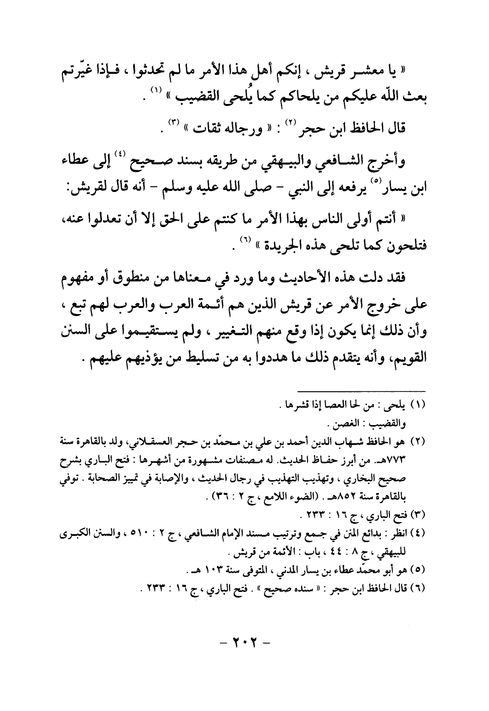 وأخرج الشافعي والبيهقي من طريقه بسند صحيح إلى عطاء بن يسار يرفعه إلى النبي -صلى الله عليه وسلم- أنه قال لقريش: «أنتم أولى الناس بهذا الأمر ما كنتم على الحق إلا أن تعدلوا عنه، فتلحون كما تلحى هذه الجريدة» .