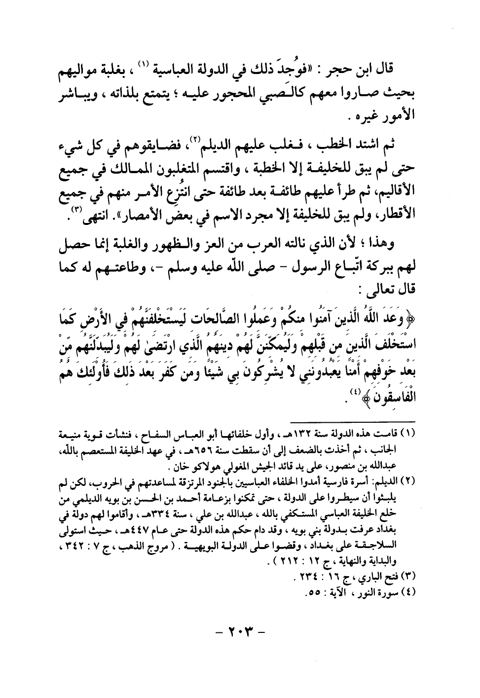 وهذا، لأن الذي نالته العرب من العز والظهور والغلبة إنما حصل لهم ببركة اتباع الرسول -صلى الله عليه وسلم-، وطاعتهم له كما قال تعالى: {وَعَدَ اللَّهُ الَّذِينَ آمَنُوا مِنْكُمْ وَعَمِلُوا الصَّالِحَاتِ لَيَسْتَخْلِفَنَّهُمْ فِي الْأَرْضِ كَمَا اسْتَخْلَفَ الَّذِينَ مِنْ قَبْلِهِمْ وَلَيُمَكِّنَنَّ لَهُمْ دِينَهُمُ الَّذِي ارْتَضَى لَهُمْ وَلَيُبَدِّلَنَّهُمْ مِنْ بَعْدِ خَوْفِهِمْ أَمْنًا يَعْبُدُونَنِي لَا يُشْرِكُونَ بِي شَيْئًا وَمَنْ كَفَرَ بَعْدَ ذَلِكَ فَأُولَئِكَ هُمُ الْفَاسِقُونَ} .