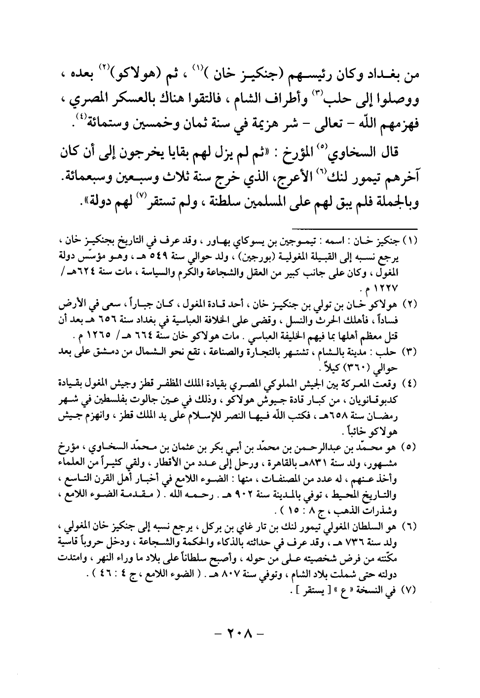 من بغداد وكان رئيسهم (جنكيزخان) ، ثم (هولاكو) بعده، ووصلوا إلى حلب وأطراف الشام، فالتقوا هناك بالعسكر المصري، فهزمهم الله -تعالى- شر هزيمة في سنة ثمان وخمسين وستمائة، قال السخاوي المؤرخ: " ثم لم يزل لهم بقايا يخرجون إلى أن كان آخرهم تيمور لنك الأعرج، الذي خرج سنة ثلاث وسبعين وسبع مائة. وبالجملة فلم يبق لهم على المسلمين سلطنة، ولم تستقر لهم دولة ".