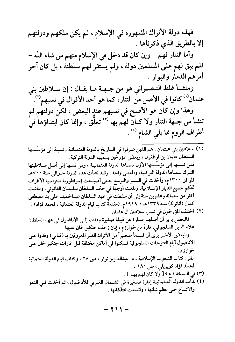 ومنشأ غلط النصراني هو من جهة ما يقال: إن سلاطين بني عثمان كانوا في الأصل من التتار، كما هو أحد الأقوال في نسبهم، وهذا وإن كان هو الأصح في نسبهم عند البعض، لكن دولتهم لم تنشأ من جهة التتار ولا كان لهم بها تعلق، وإنما كان ابتداؤها في أطراف الروم مما يلي الشام.
