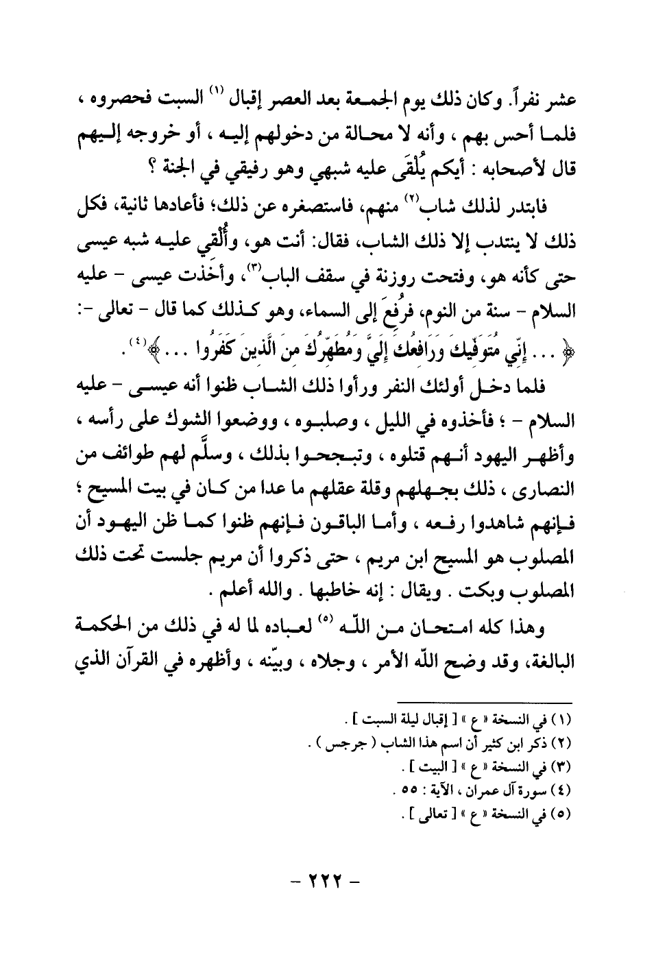 فابتدر لذلك شاب منهم، فاستصغره عن ذلك، فأعادها ثانية، فكل ذلك لا ينتدب إلا ذلك الشاب، فقال: أنت هو، وألقي عليه شبه عيسى حتى كأنه هو، وفتحت روزنة في سقف الباب، وأخذت عيسى -عليه السلام- سنة من النوم، فرفع إلى السماء، وهو كذلك كما قال -تعالى-: {إِنِّي مُتَوَفِّيكَ وَرَافِعُكَ إِلَيَّ وَمُطَهِّرُكَ مِنَ الَّذِينَ كَفَرُوا} ... .