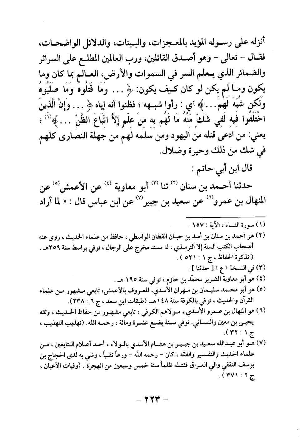 أنزله على رسوله المؤيد بالمعجزات، والبينات، والدلائل الواضحات، فقال -تعالى- وهو أصدق القائلين، ورب العالمين المطلع على السرائر والضمائر الذي يعلم السر في السماوات والأرض، العالم بما كان وما يكون وما لم يكن لو كان كيف يكون: {وَمَا قَتَلُوهُ وَمَا صَلَبُوهُ وَلَكِنْ شُبِّهَ لَهُمْ} أي: رأوا شبهه؛ فظنوا أنه إياه {وَإِنَّ الَّذِينَ اخْتَلَفُوا فِيهِ لَفِي شَكٍّ مِنْهُ مَا لَهُمْ بِهِ مِنْ عِلْمٍ إِلَّا اتِّبَاعَ الظَّنِّ} يعني: من ادعى قتله من اليهود ومن سلمه لهم من جهلة النصارى كلهم في شك من ذلك وحيرة وضلال.