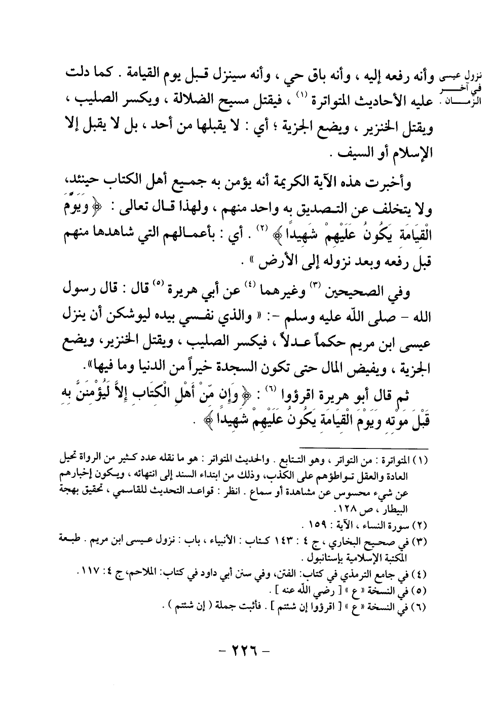 وأنه رفعه إليه، وأنه باق حي، وأنه سينزل قبل يوم القيامة، كما دلت عليه الأحاديث المتواترة، فيقتل مسيح الضلالة، ويكسر الصليب، ويقتل الخنزير، ويضع الجزية؛ أي: لا يقبلها من أحد، بل لا يقبل إلا الإسلام أو السيف.