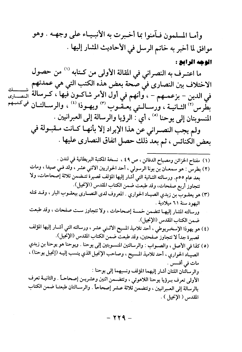 ما اعترف به النصراني في المقالة الأولى من كتابه من حصول الاختلاف بين النصارى في صحة بعض هذه الكتب التي هي عمدتهم في الدين - بزعمهم -، وأنهم في أول الأمر شاكون فيها، كرسالة بطرس الثانية، ورسالتي يعقوب ويهوذا، والرسالتان المنسوبتان إلى يوحنا، أي: الرؤيا والرسالة إلى العبرانيين.