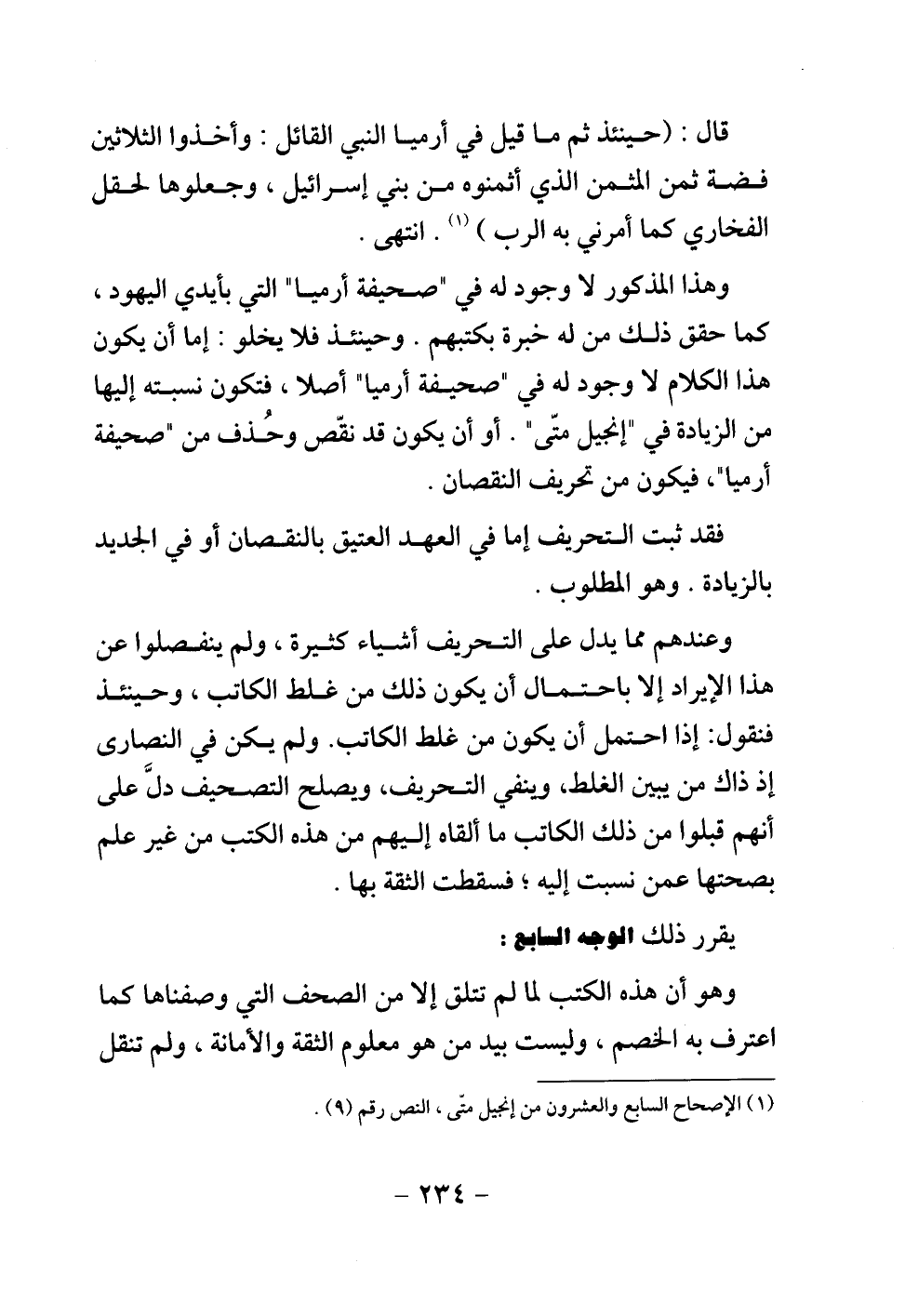 وهذا المذكور لا وجود له في " صحيفة أرميا " التي بأيدي اليهود، كما حقق ذلك من له خبرة بكتبهم. وحينئذ فلا يخلو: إما أن يكون هذا الكلام لا وجود له في " صحيفة أرميا " أصلا، فتكون نسبته إليها من الزيادة في " إنجيل متى ". أو أن يكون قد نقص وحذف من " صحيفة أرميا "، فيكون من تحريف النقصان.