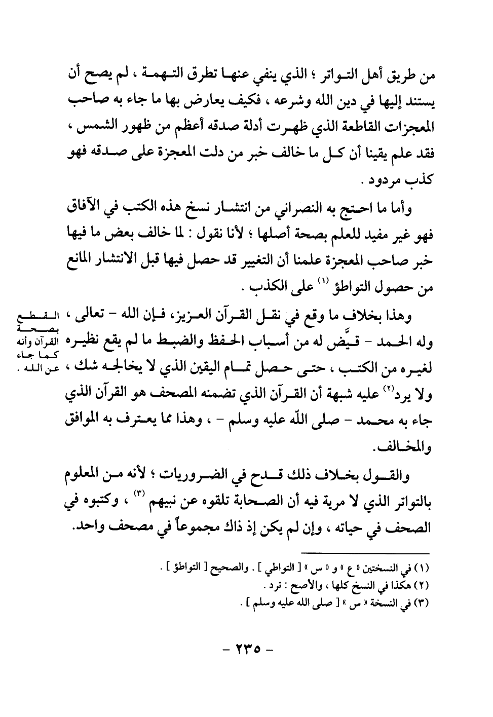 وأما ما احتج به النصراني من انتشار نسخ هذه الكتب في الآفاق، فهو غير مفيد للعلم بصحة أصلها، لأنا نقول: لما خالف بعض ما فيها خبر صاحب المعجزة، علمنا أن التغيير قد حصل فيها قبل الانتشار المانع من حصول التواطؤ على الكذب.