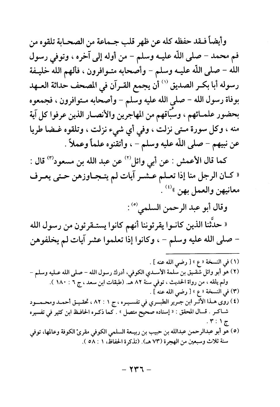 حدثنا الذين كانوا يقرئوننا أنهم كانوا يستقرئون من رسول الله -صلى الله عليه وسلم-، وكانوا إذا تعلموا عشر آيات لم يخلفوهن