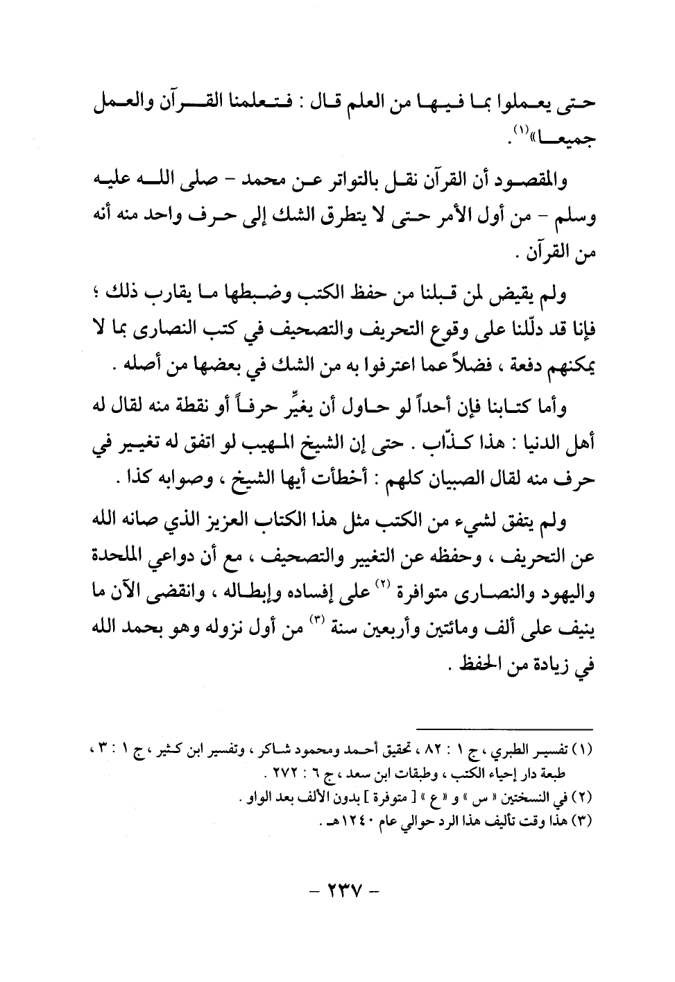ولم يتفق لشيء من الكتب مثل هذا الكتاب العزيز الذي صانه الله عن التحريف، وحفظه عن التغيير والتصحيف، مع أن دواعي الملحدة واليهود والنصارى متوافرة على إفساده وإبطاله، وانقضى الآن ما ينيف على ألف ومائتين وأربعين سنة من أول نزوله وهو بحمد الله في زيادة من الحفظ.