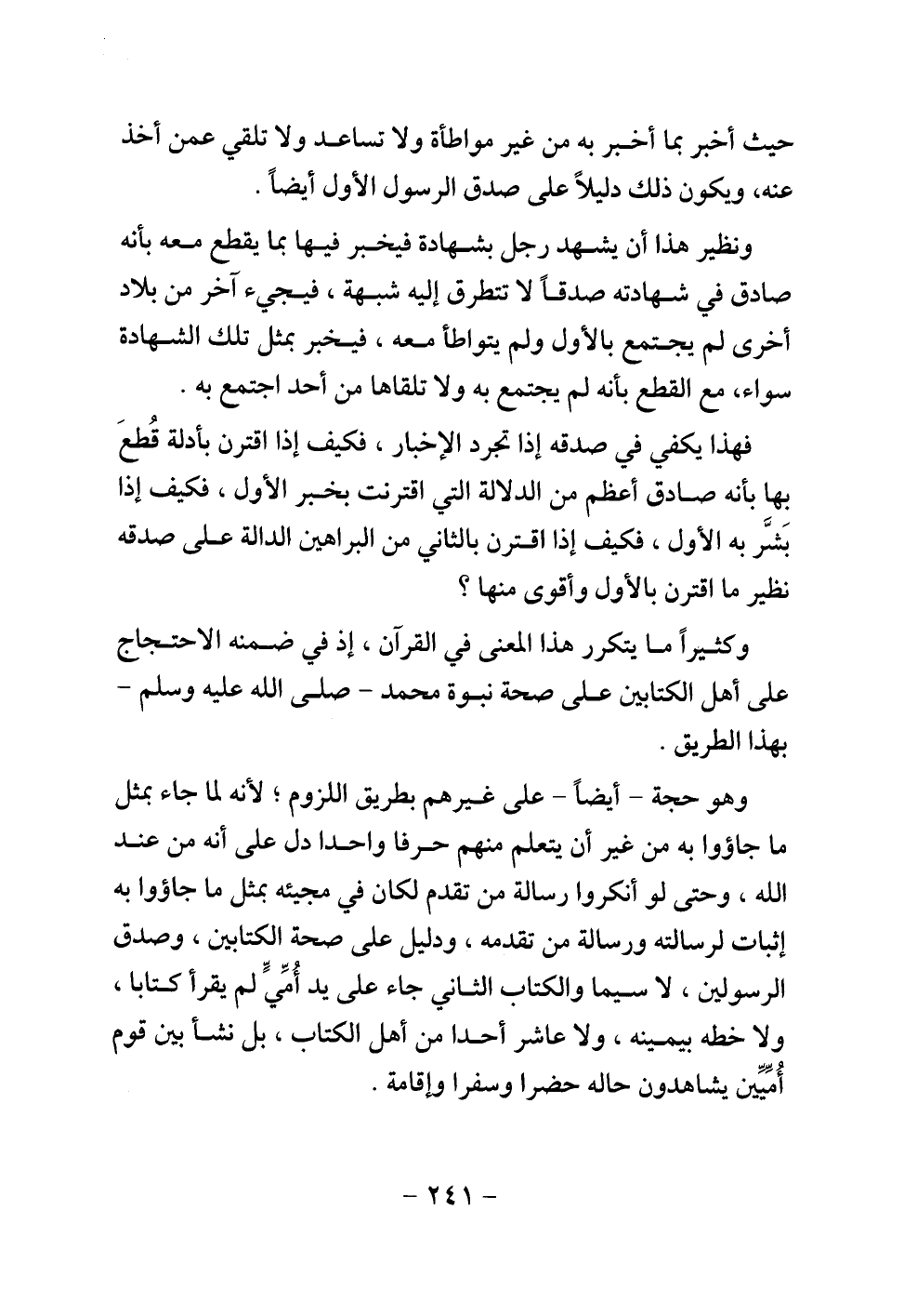 وهو حجة -أيضا- على غيرهم بطريق اللزوم، لأنه لما جاء بمثل ما جاءوا به من غير أن يتعلم منهم حرفا واحدا دل على أنه من عند الله، وحتى لو أنكروا رسالة من تقدم لكان في مجيئه بمثل ما جاءوا به إثبات لرسالته ورسالة من تقدمه، ودليل على صحة الكتابين، وصدق الرسولين، لا سيما والكتاب الثاني جاء على يد أمي لم يقرأ كتابا، ولا خطه بيمينه، ولا عاشر أحدا من أهل الكتاب، بل نشأ بين قوم أميين يشاهدون حاله حضرا وسفرا وإقامة.