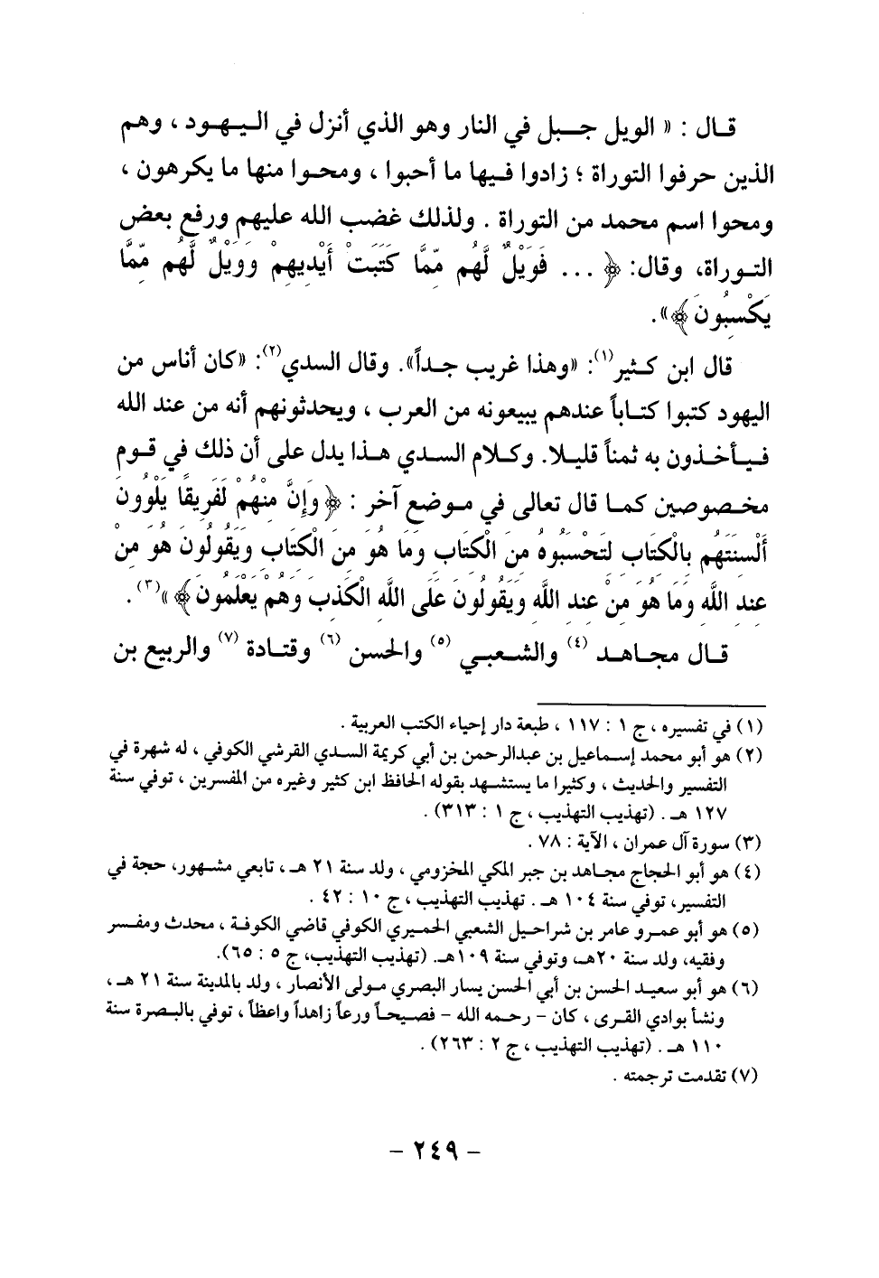 قال ابن كثير: " وهذا غريب جدا ". وقال السدي: كان أناس من اليهود كتبوا كتابا عندهم يبيعونه من العرب، ويحدثونهم أنه من عند الله فيأخذون به ثمنا قليلا. وكلام السدي هذا يدل على أن ذلك في قوم مخصوصين كما قال تعالى في موضع آخر: {وَإِنَّ مِنْهُمْ لَفَرِيقًا يَلْوُونَ أَلْسِنَتَهُمْ بِالْكِتَابِ لِتَحْسَبُوهُ مِنَ الْكِتَابِ وَمَا هُوَ مِنَ الْكِتَابِ وَيَقُولُونَ هُوَ مِنْ عِنْدِ اللَّهِ وَمَا هُوَ مِنْ عِنْدِ اللَّهِ وَيَقُولُونَ عَلَى اللَّهِ الْكَذِبَ وَهُمْ يَعْلَمُونَ} .