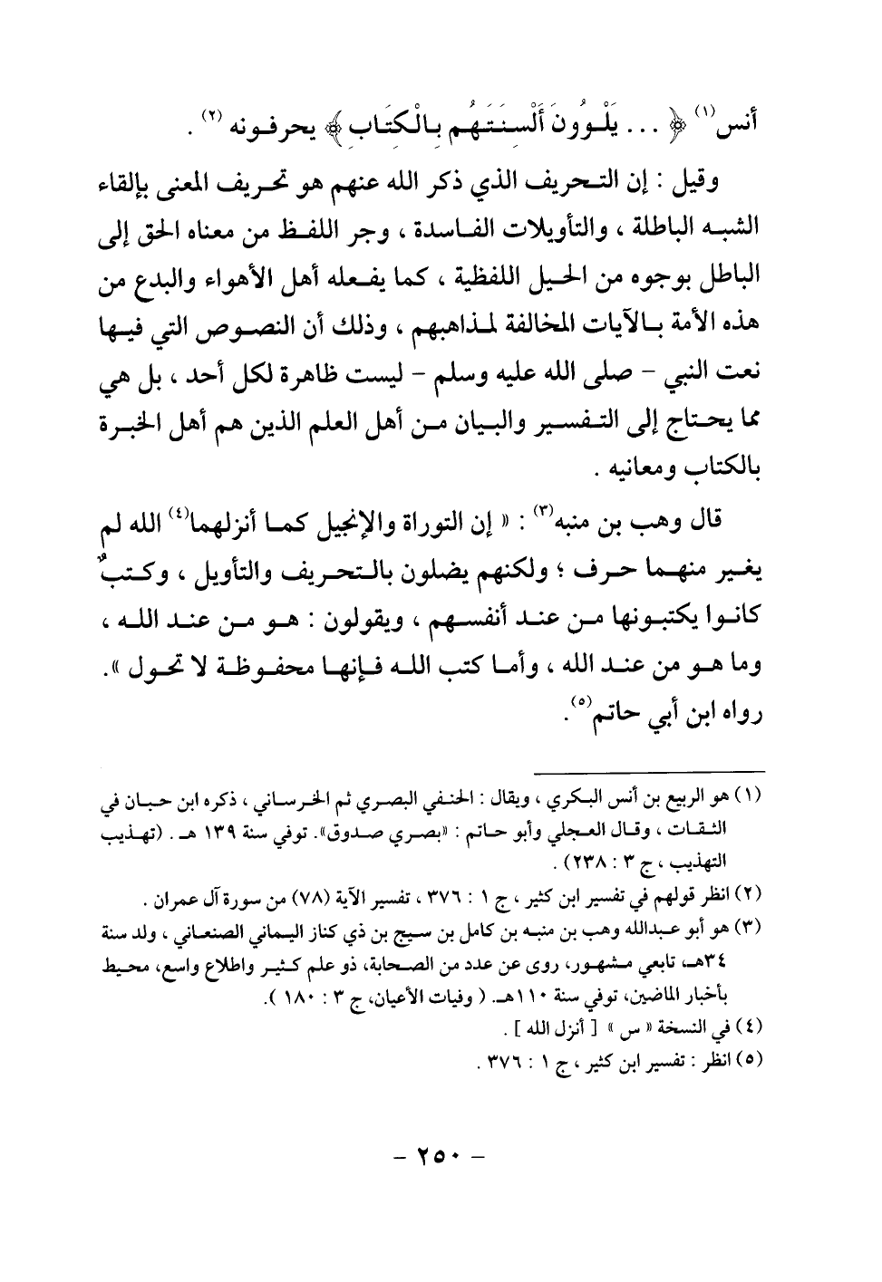 قال وهب بن منبه: "إن التوراة والإنجيل كما أنزلهما الله لم يغير منهما حرف؛ ولكنهم يضلون بالتحريف والتأويل، وكتب كانوا يكتبونها من عند أنفسهم، ويقولون: هو من عند الله، وما هو من عند الله، وأما كتب الله فإنها محفوظة لا تحول". رواه ابن أبي حاتم.