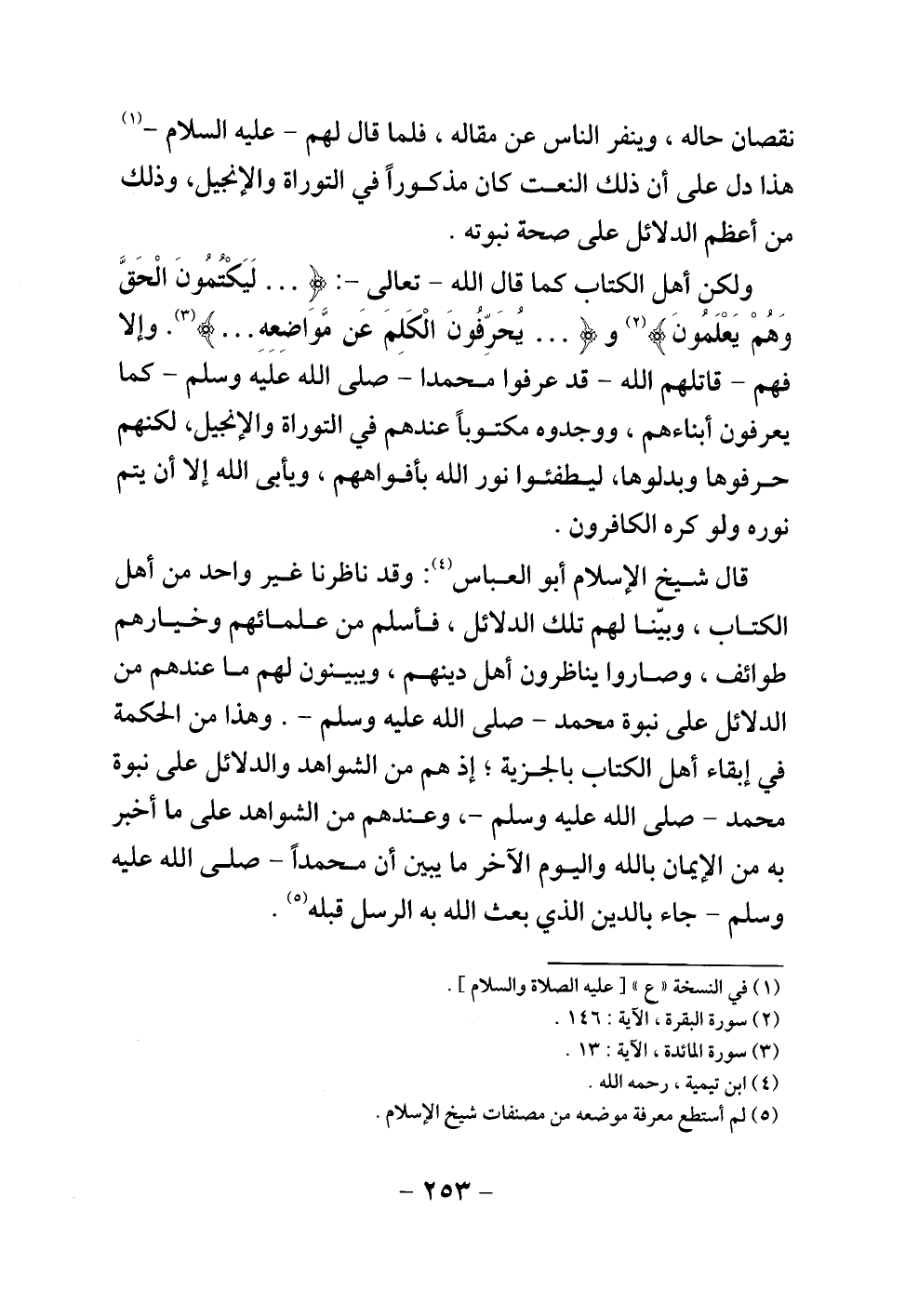 قال شيخ الإسلام أبو العباس: وقد ناظرنا غير واحد من أهل الكتاب، وبينا لهم تلك الدلائل، فأسلم من علمائهم وخيارهم طوائف، وصاروا يناظرون أهل دينهم، ويبينون لهم ما عندهم من الدلائل على نبوة محمد -صلى الله عليه وسلم- وهذا من الحكمة في إبقاء أهل الكتاب بالجزية؛ إذ هم من الشواهد والدلائل على نبوة محمد - صلى الله عليه وسلم -، وعندهم من الشواهد على ما أخبر به من الإيمان بالله واليوم الآخر ما يبين أن محمدا -صلى الله عليه وسلم- جاء بالدين الذي بعث الله به الرسل قبله.