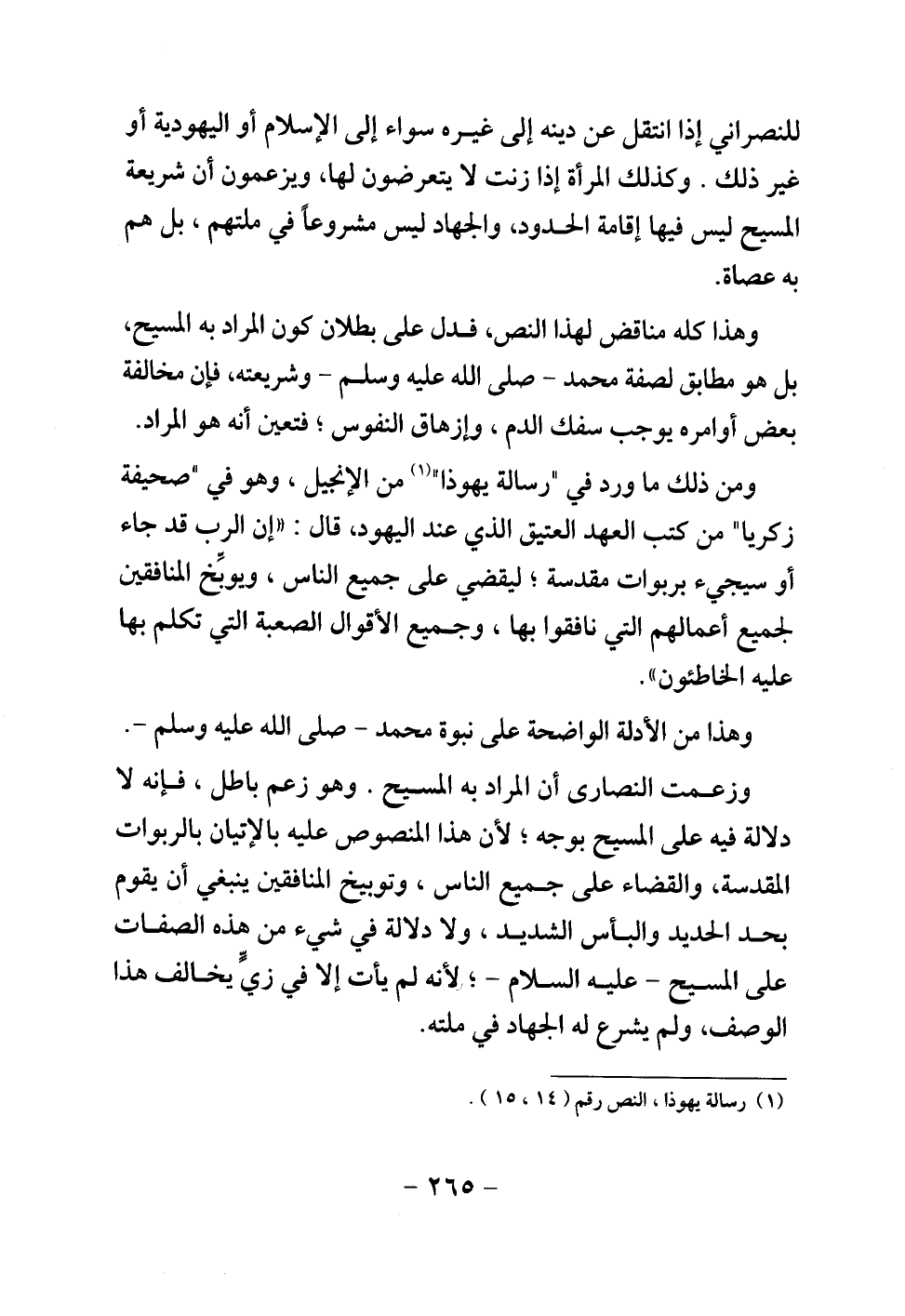 وهذا كله مناقض لهذا النص، فدل على بطلان كون المراد به المسيح، بل هو مطابق لصفة محمد -صلى الله عليه وسلم- وشريعته، فإن مخالفة بعض أوامره يوجب سفك الدم، وإزهاق النفوس؛ فتعين أنه هو المراد.