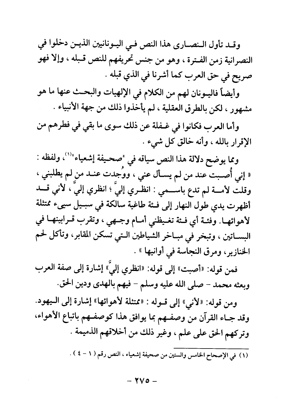 ومما يوضح دلالة هذا النص سياقه في " صحيفة إشعياء "، ولفظه: " إني أصبت عند من لم يسأل عني، ووجدت عند من لم يطلبني، وقلت لأمة لم تدع باسمي: انظري إلي، لأني قد أظهرت يدي طول النهار إلى فئة طاغية سالكة في سبيل سيئ ممتثلة لأهوائها. وفئة أي فئة تغيظني أمام وجهي، وتقرب قرابينها في البساتين، وتبخر في مباخر الشياطين التي تسكن المقابر، وتأكل لحم الخنازير، ومرق النجاسة في أوانيها ".