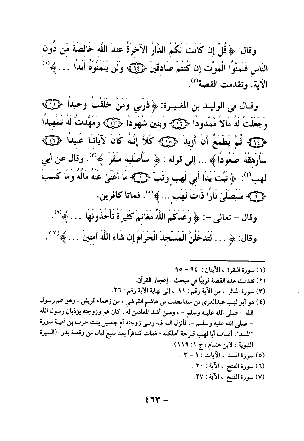 وقال في الوليد بن المغيرة: {ذَرْنِي وَمَنْ خَلَقْتُ وَحِيدًا وَجَعَلْتُ لَهُ مَالًا مَمْدُودًا وَبَنِينَ شُهُودًا وَمَهَّدْتُ لَهُ تَمْهِيدًا ثُمَّ يَطْمَعُ أَنْ أَزِيدَ كَلَّا إِنَّهُ كَانَ لِآيَاتِنَا عَنِيدًا سَأُرْهِقُهُ صَعُودًا} ... إلى قوله: {سَأُصْلِيهِ سَقَرَ} . وقال عن أبي لهب: {تَبَّتْ يَدَا أَبِي لَهَبٍ وَتَبَّ مَا أَغْنَى عَنْهُ مَالُهُ وَمَا كَسَبَ سَيَصْلَى نَارًا ذَاتَ لَهَبٍ} .... . فماتا كافرين.