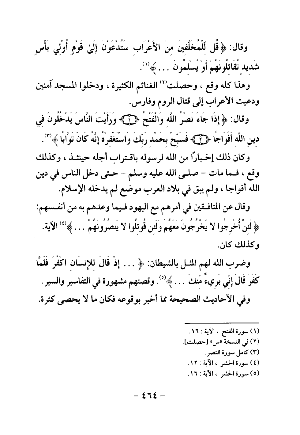 وقال: {قُلْ لِلْمُخَلَّفِينَ مِنَ الْأَعْرَابِ سَتُدْعَوْنَ إِلَى قَوْمٍ أُولِي بَأْسٍ شَدِيدٍ تُقَاتِلُونَهُمْ أَوْ يُسْلِمُونَ} ... .