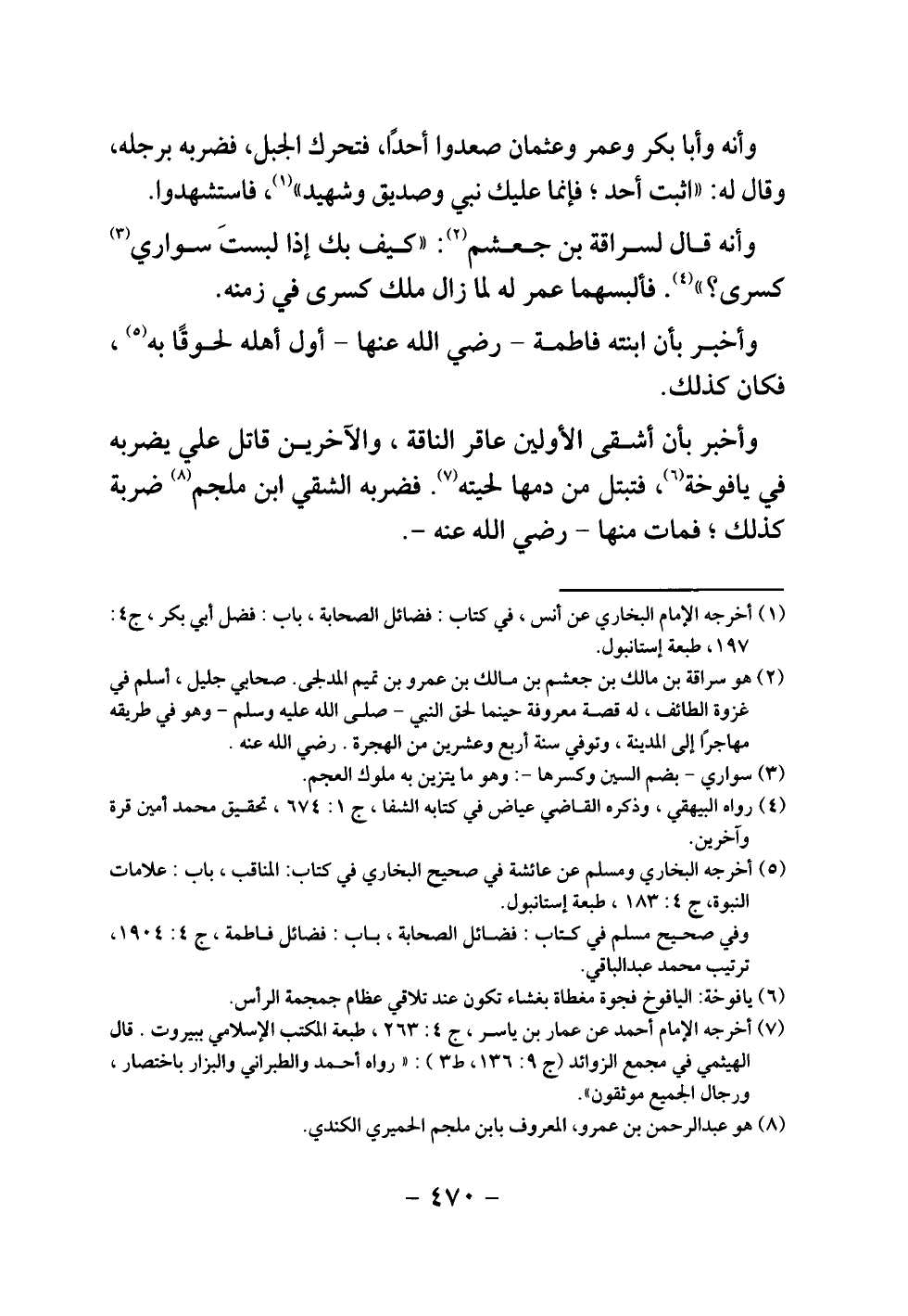 وأنه قال لسراقة بن جعشم: " «كيف بك إذا لبست سواري كسرى؟» ". فألبسهما عمر له لما زال ملك كسرى في زمنه.