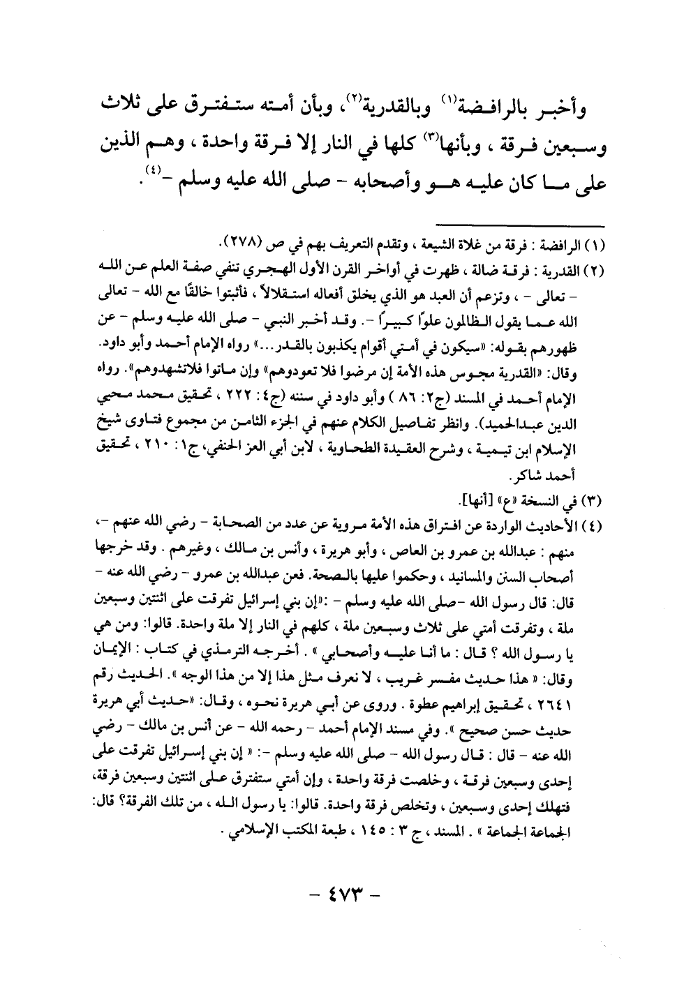 وأخبر بالرافضة وبالقدرية، وبأن أمته ستفترق على ثلاث وسبعين فرقة، وبأنها كلها في النار إلا فرقة واحدة، وهم الذين على ما كان عليه هو وأصحابه صلى الله عليه وسلم.