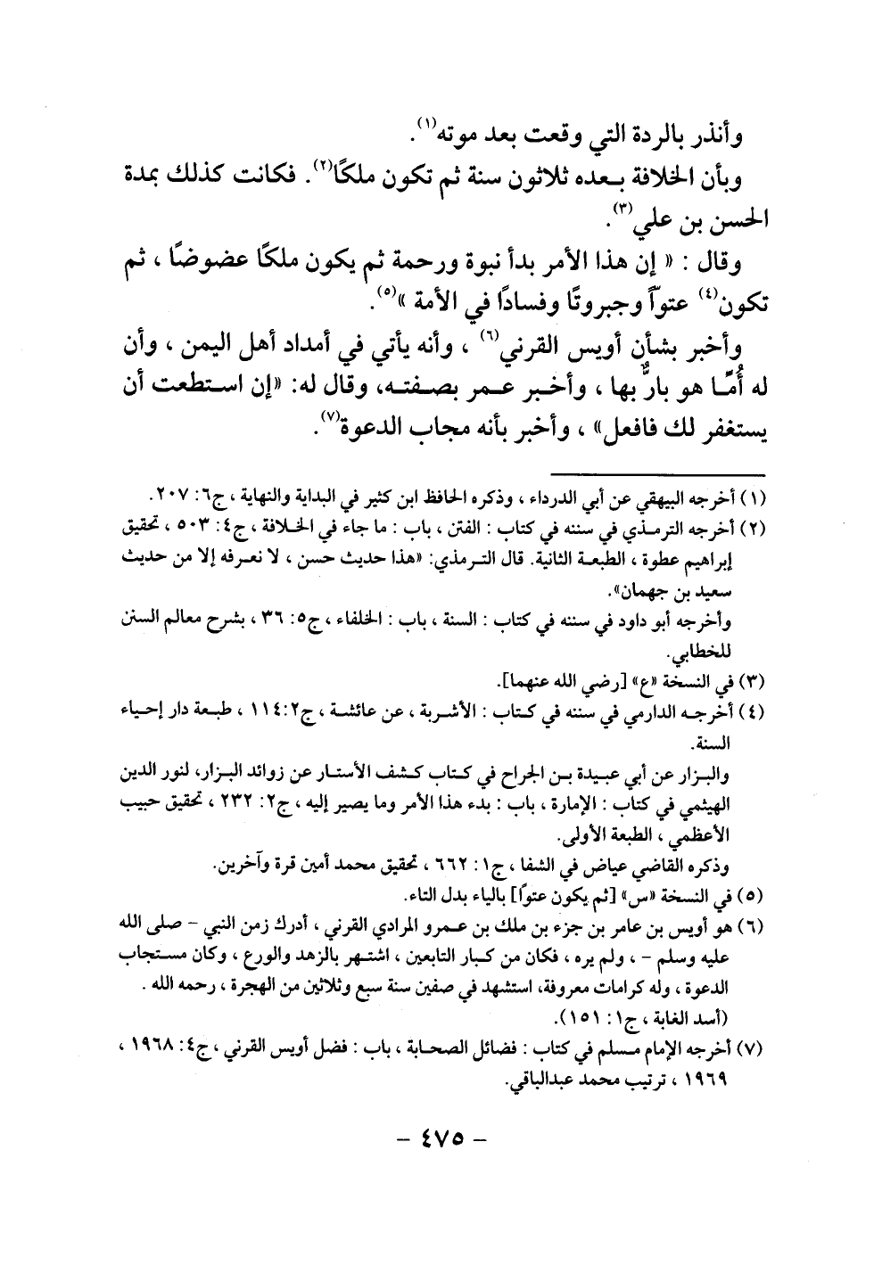 وقال: " «إن هذا الأمر بدأ نبوة ورحمة ثم يكون عضوضا، ثم تكون عتوا وجبروتا وفسادا في الأمة» ".