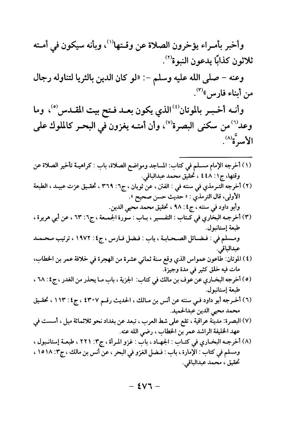 وأنه أخبر بالموتان الذي يكون بعد فتح بيت المقدس، وما وعد من سكنى البصرة، وأن أمته يغزون في البحر كالملوك على الأسرة.
