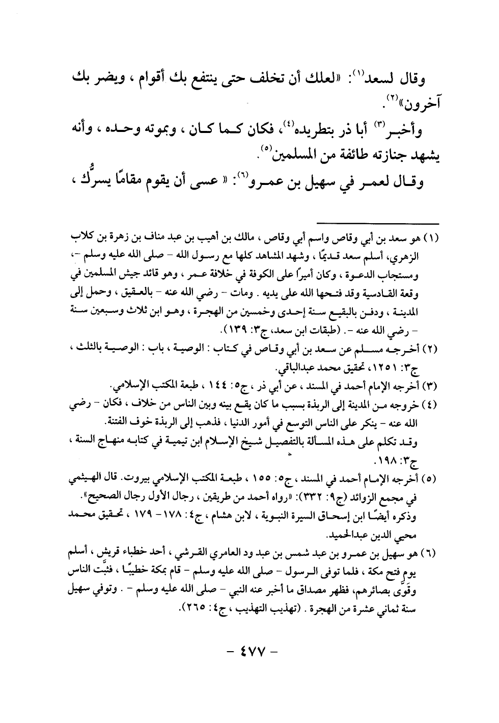 وقال لسعد: " لعلك أن تخلف حتى ينتفع بك أقوام، ويضر بك آخرون ".