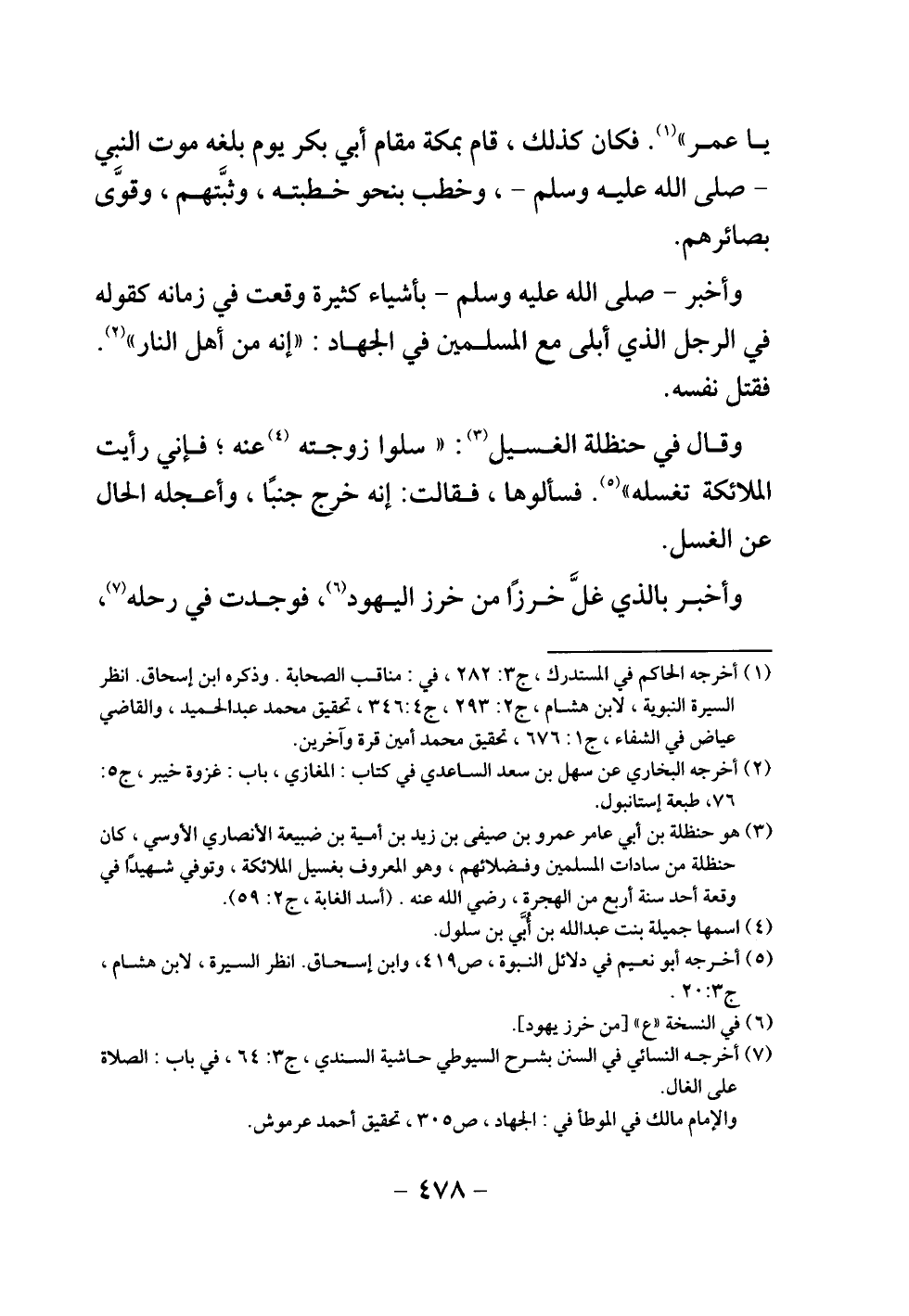 وقال في حنظلة الغسيل: " «سلوا زوجته عنه، فإني رأيت الملائكة تغسله» ". فسألوها، فقالت: إنه خرج جنبا، وأعجله الحال عن الغسل.