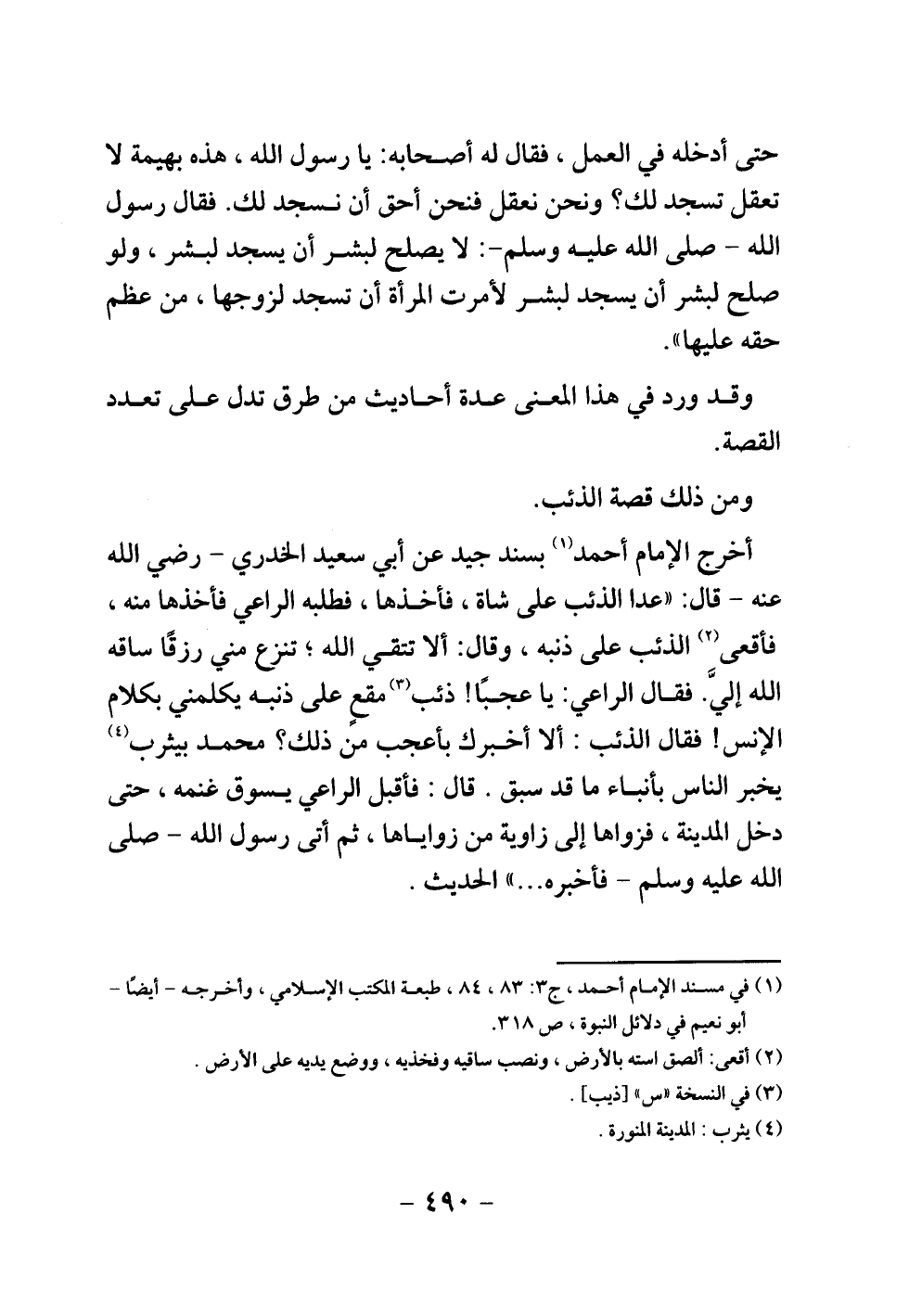 أخرج الإمام أحمد بسند جيد عن أبي سعيد الخدري - رضي الله عنه - قال: «عدا الذئب على شاة، فأخذها، فطلبه الراعي فأخذها منه، فأقعى الذئب على ذنبه، وقال: ألا تتقي الله، تنزع مني رزقا ساقه الله إلي. فقال الراعي: يا عجبا! ذئب مقع على ذنبه يكلمني بكلام الإنس! فقال الذئب: ألا أخبرك بأعجب من ذلك؟ محمد بيثرب يخبر الناس بأنباء ما قد سبق. قال: فأقبل الراعي يسوق غنمه، حتى دخل المدينة، فزواها إلى زاوية من زواياها، ثم أتى رسول الله - صلى الله عليه وسلم - فأخبره» ... الحديث.